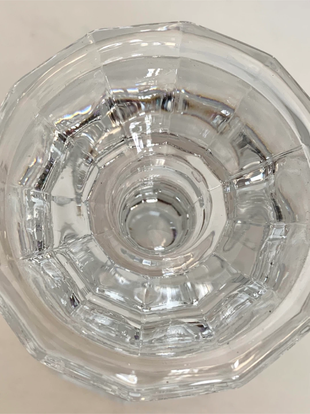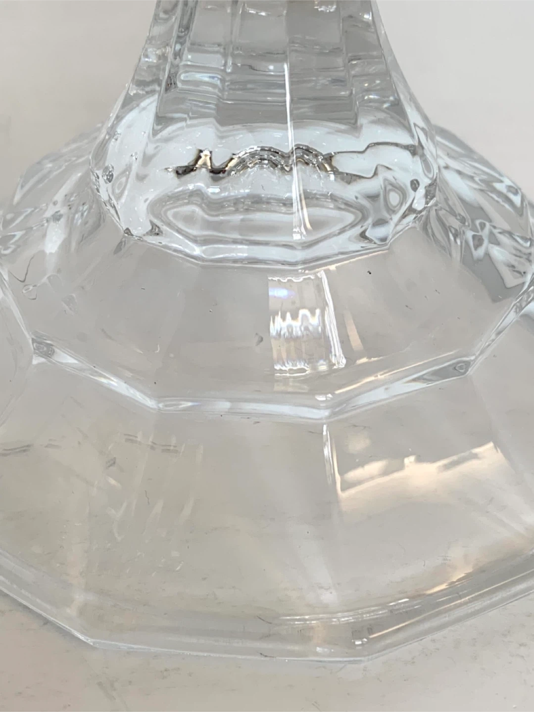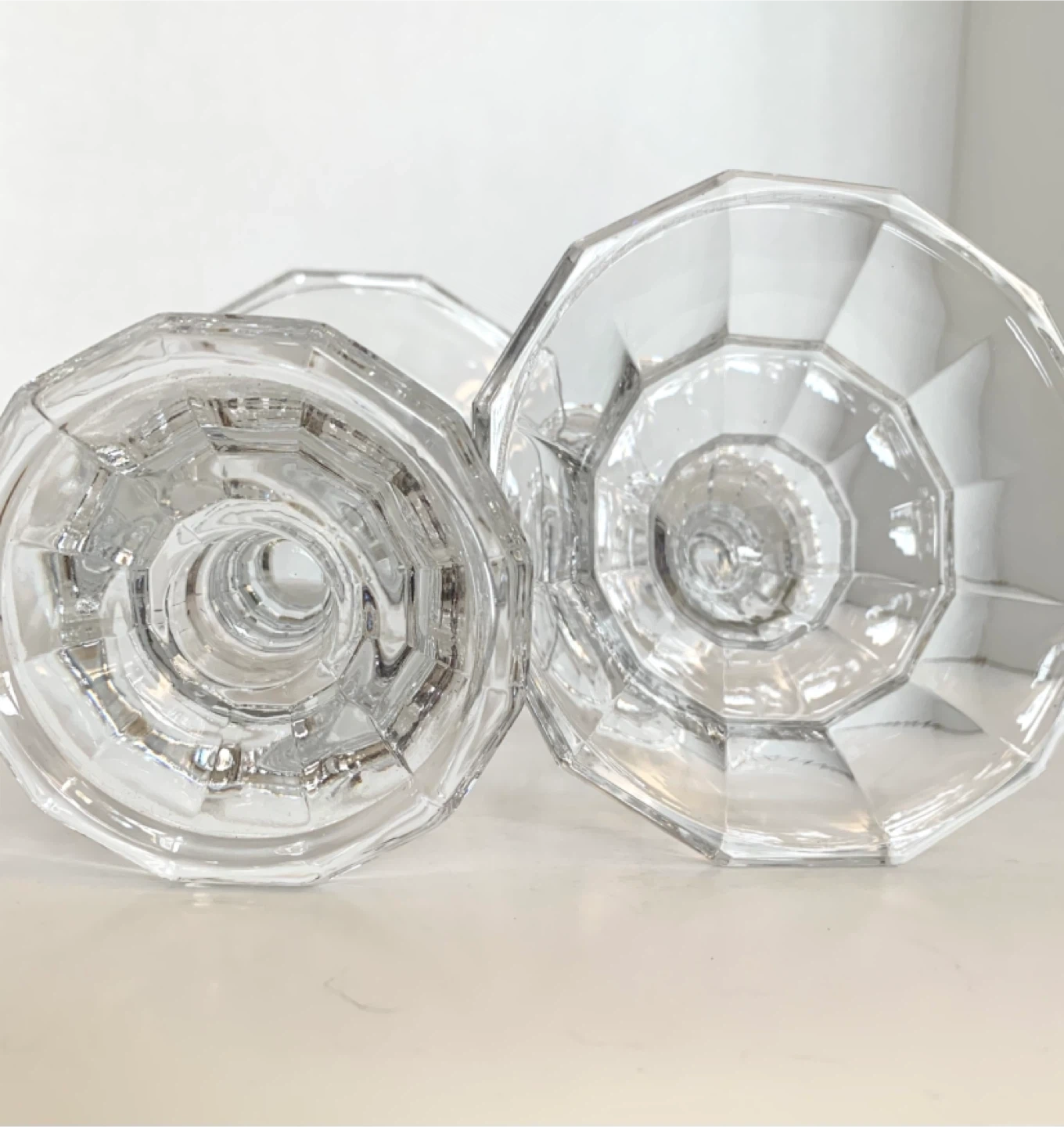 This is a set of two clear glass candlesticks. They have a faceted design on the base and stem. Made of glass.