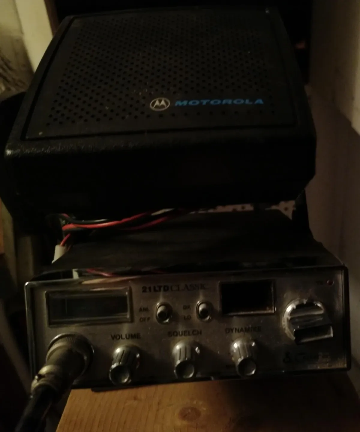 This is a Motorola 21 LTD Classic CB radio. It features volume, squelch, and dynamike controls. It also has ANL and DX switches. It's a classic piece for communication!
