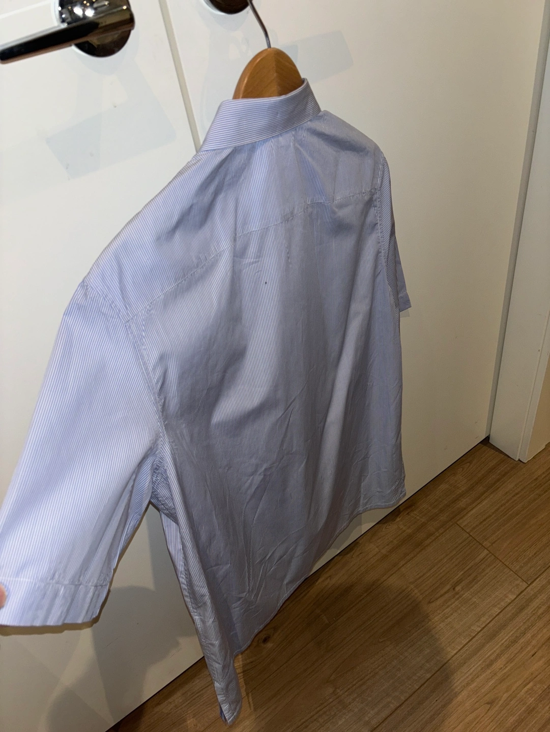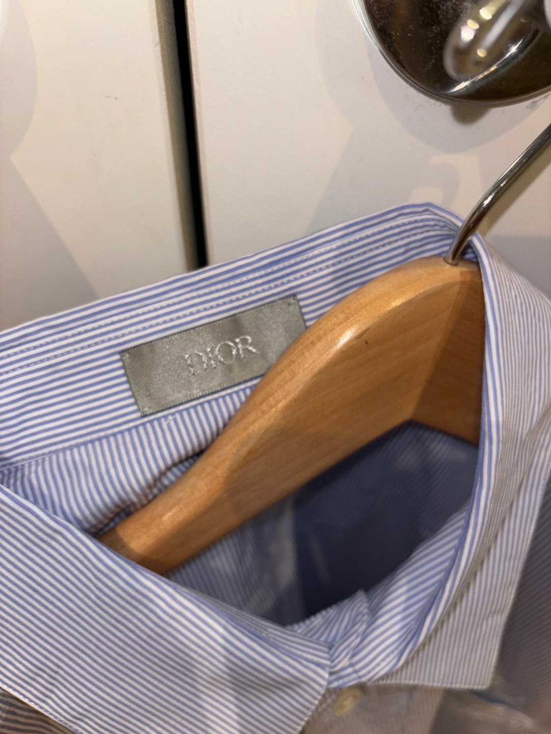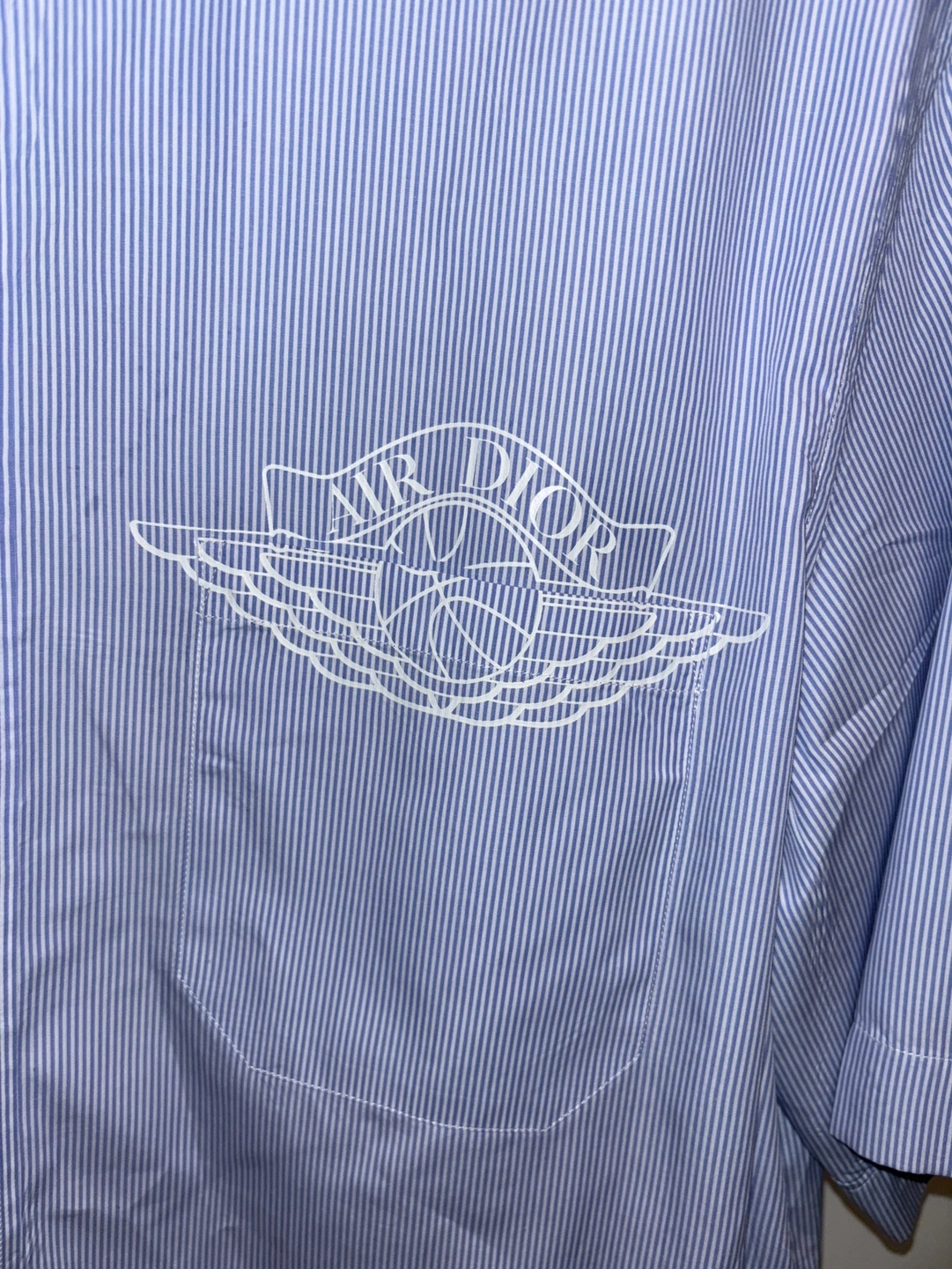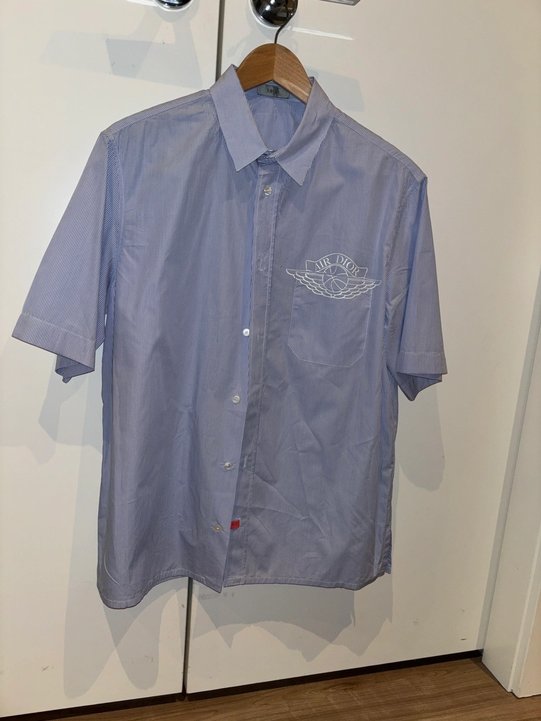 Blue and white striped short sleeve button-up shirt with a large Air Dior logo on the chest. The shirt has a standard collar and button cuffs. Worn just once. Rare collaboration.