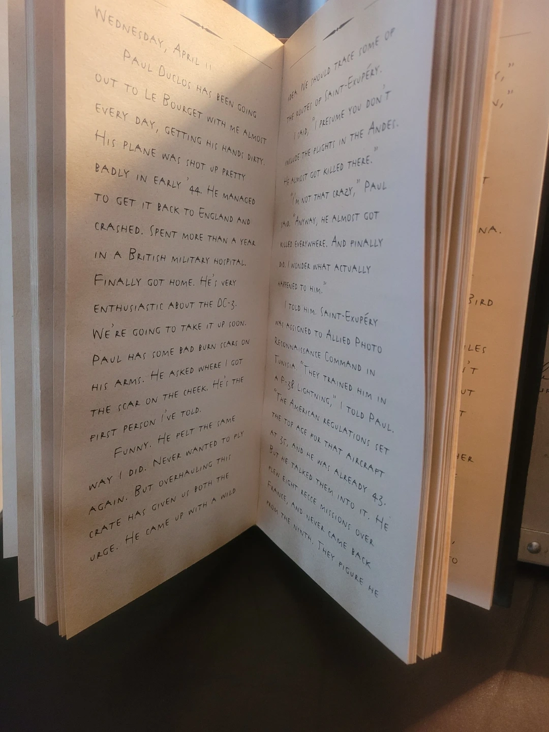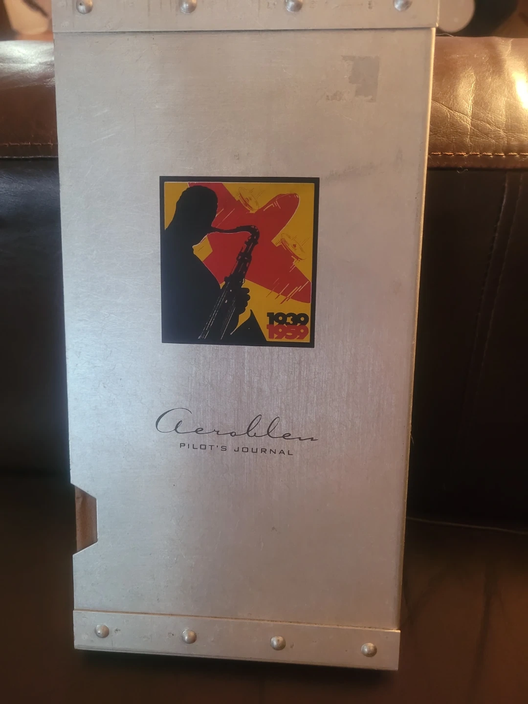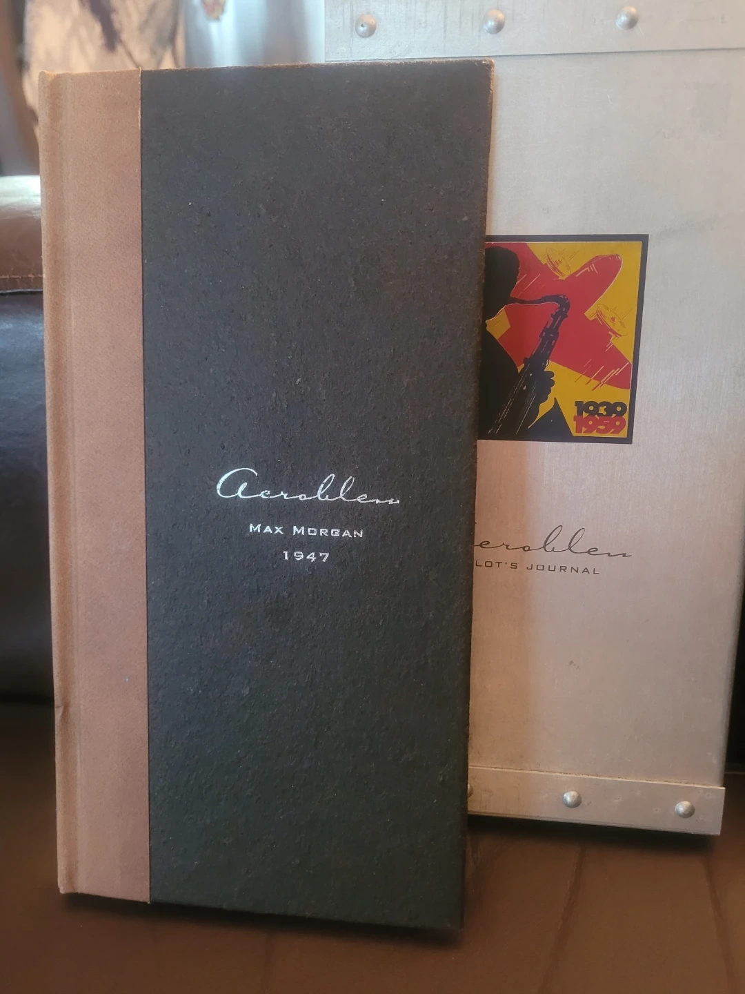 This is the Aeroblen Pilot's Journal by Max Morgan, dated 1947. It's a collection of handwritten entries detailing aviation adventures. The journal is housed in a decorative metal case featuring artwork from 1939.