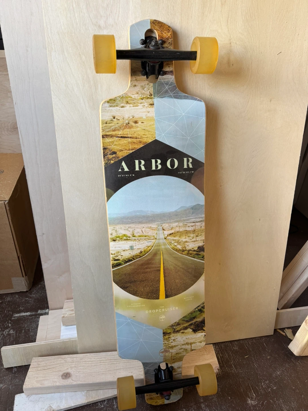 This is an Arbor Dropcruiser longboard skateboard. It features a walnut deck with a striking desert road graphic on the bottom. The yellow wheels are designed for smooth cruising.