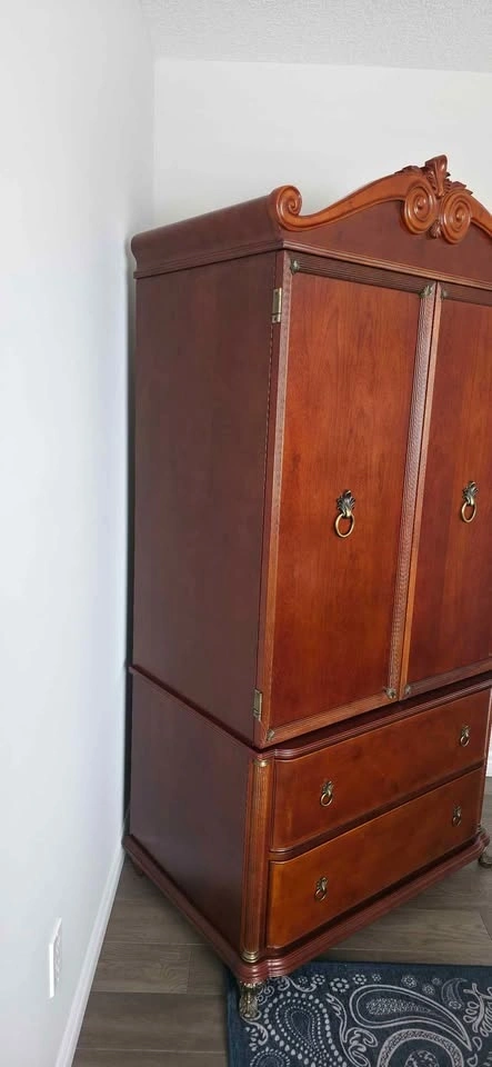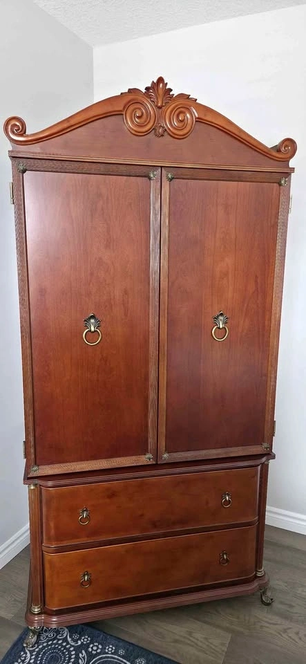 Classic Bombay Company Armoire with 2 drawers. This piece measures 23” deep x 36” wide x 76” tall. Cash only. Must pickup. Can be disassembled in two pieces.
