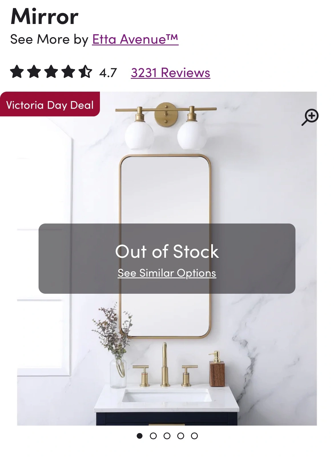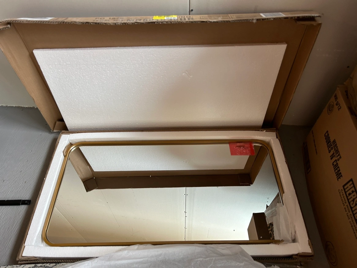 30Brand new. Gold framed mirror with rounded corners still in box.