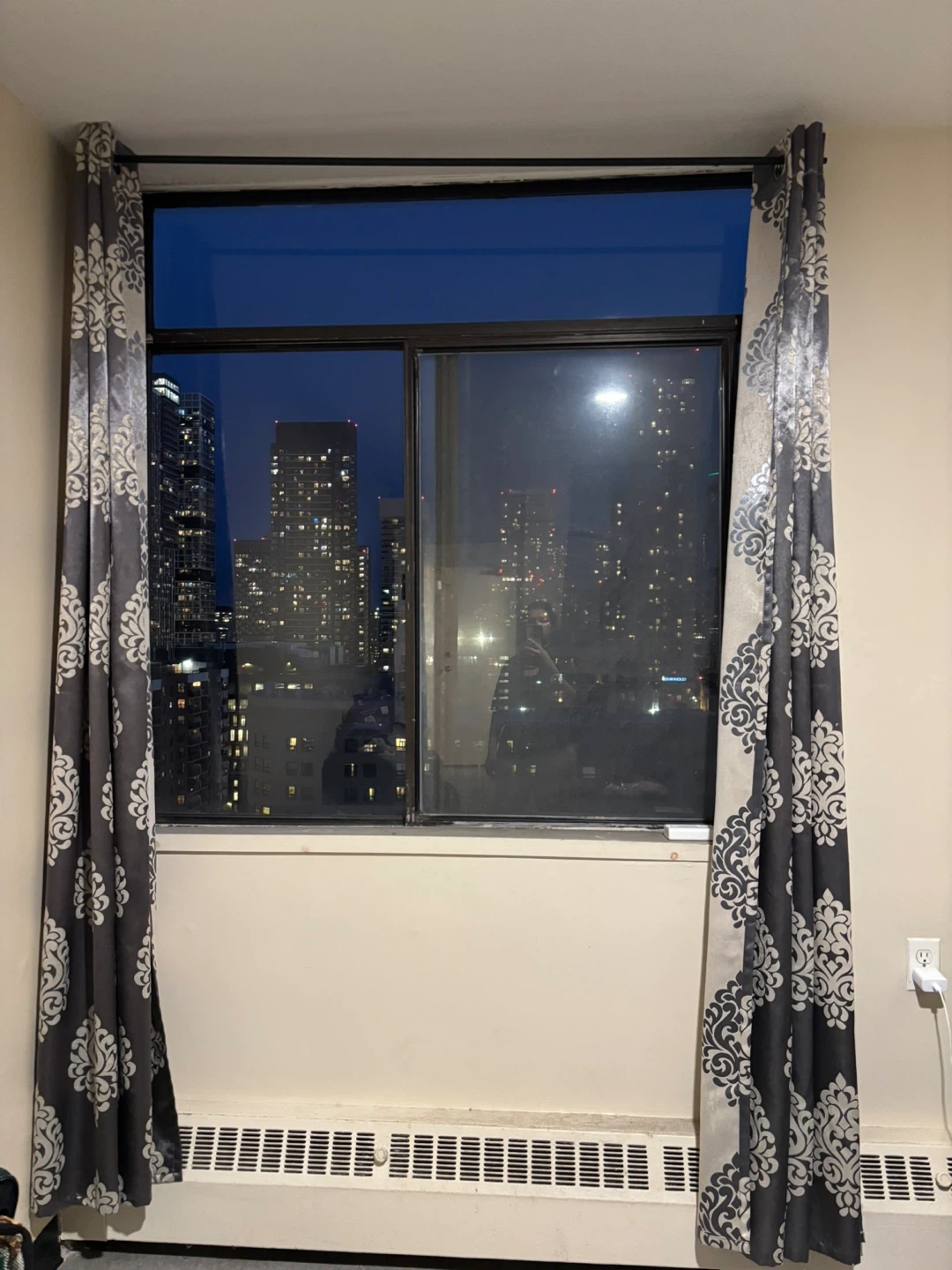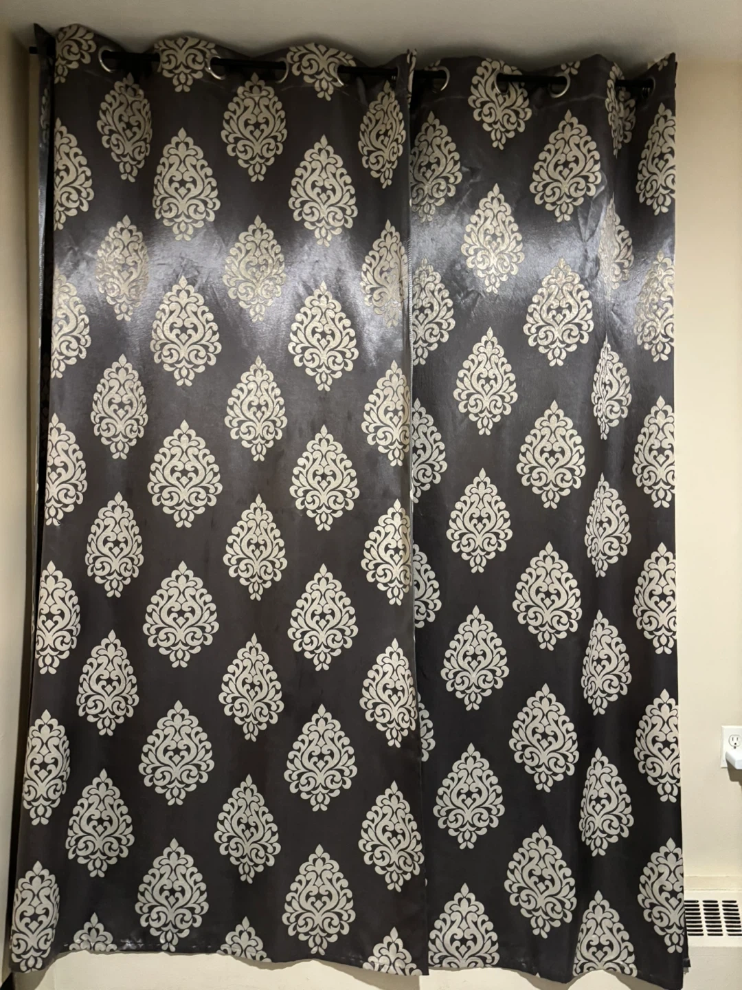 These curtains feature a classic damask pattern in a deep charcoal grey with a lighter grey or cream-coloured motif. They appear to be blackout curtains, designed to block out light. The fabric has a subtle sheen, adding a touch of elegance. Two panels are shown, and they hang from grommets.