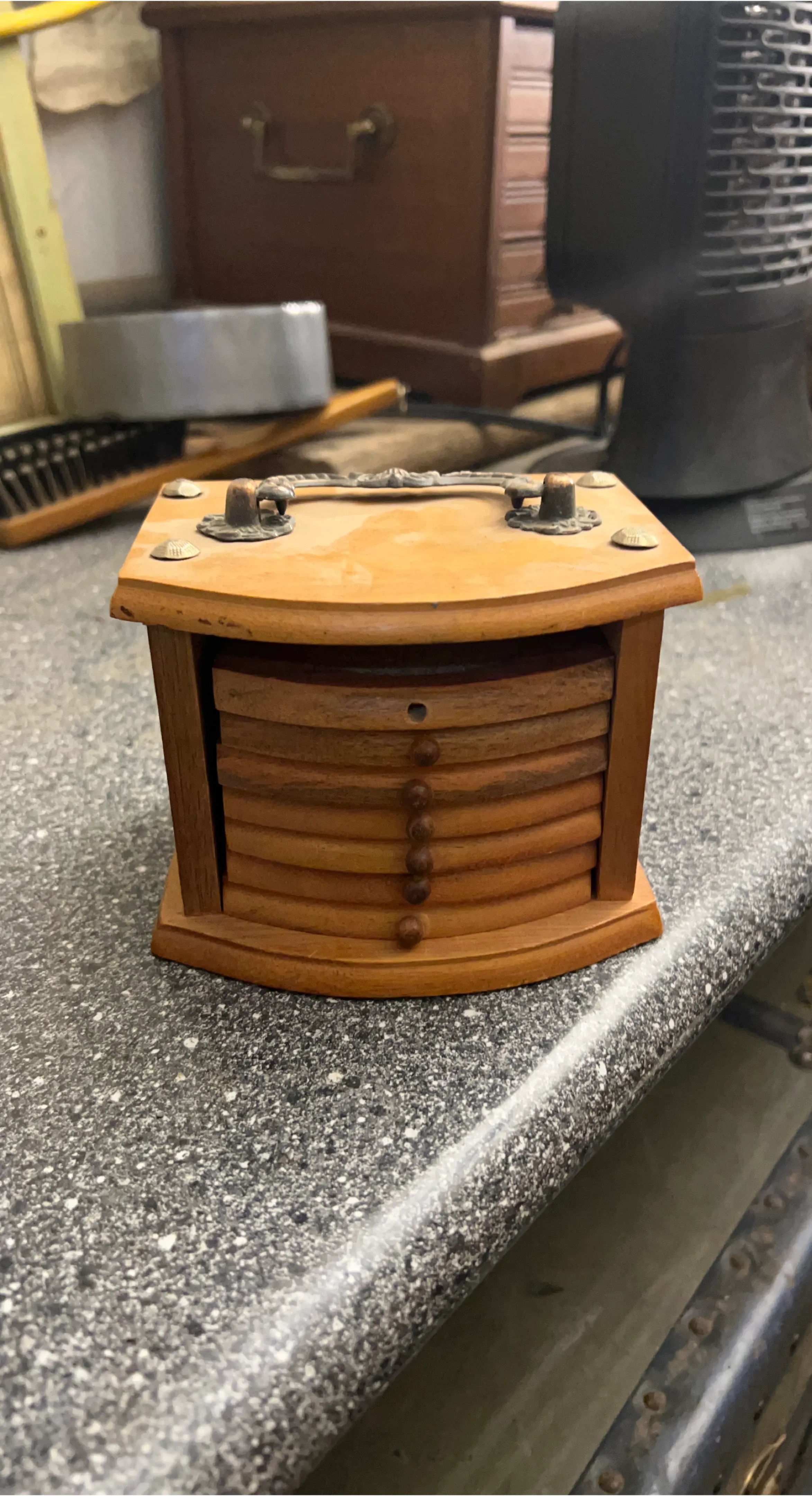 This set includes a wooden holder and coasters. The holder has ornate metal accents and a handle. Perfect for protecting surfaces from drink rings.