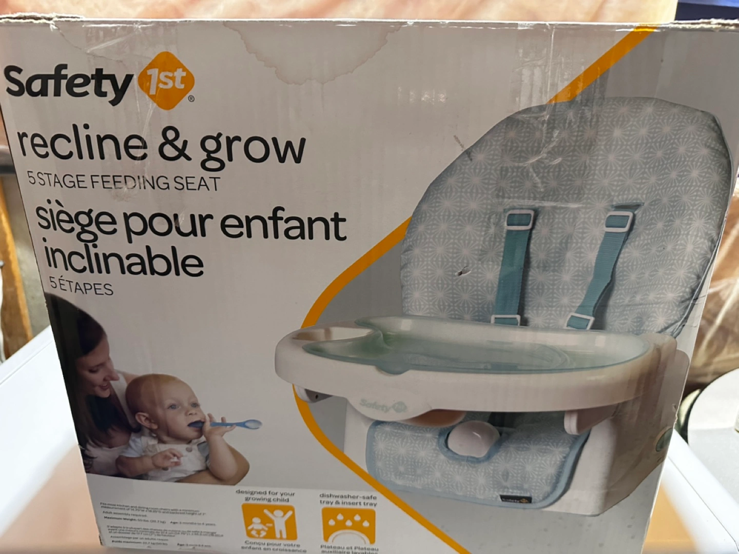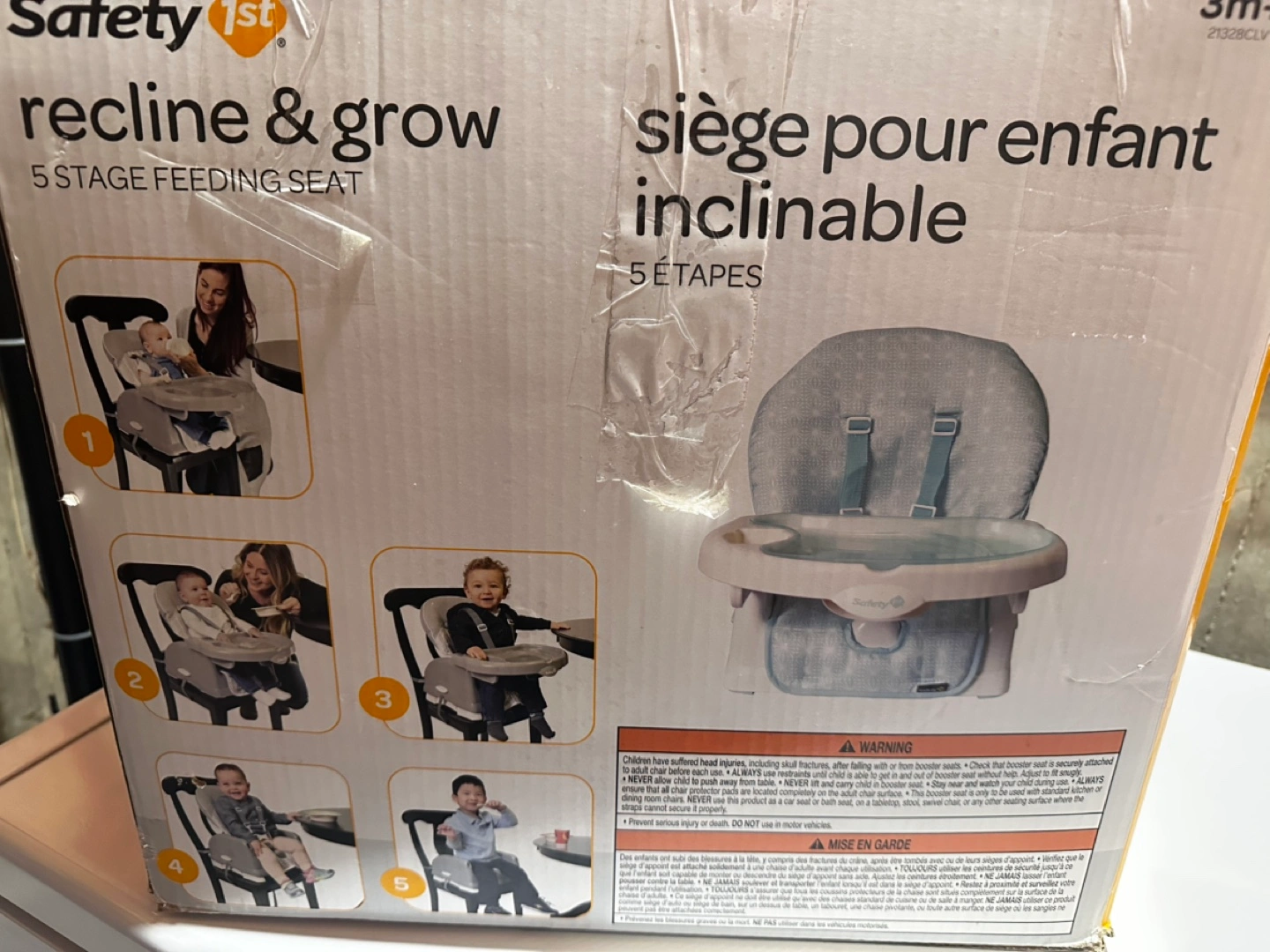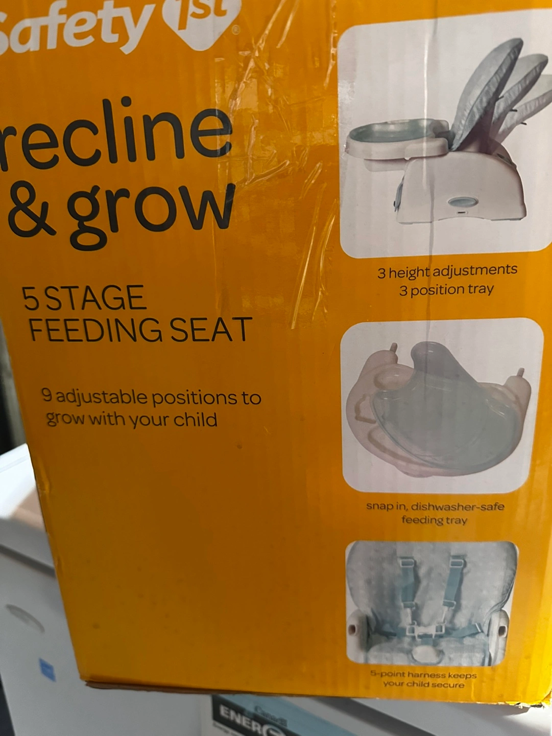 38Five-stage feeding seat, reclines, adjustable height, three-position tray, dishwasher-safe tray, five-point harness. Great for growing children.
