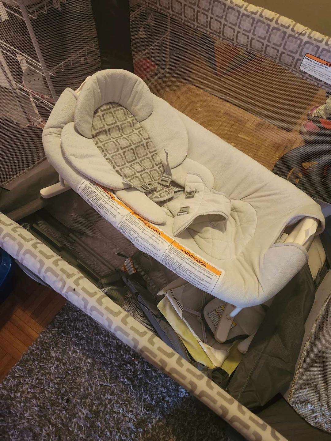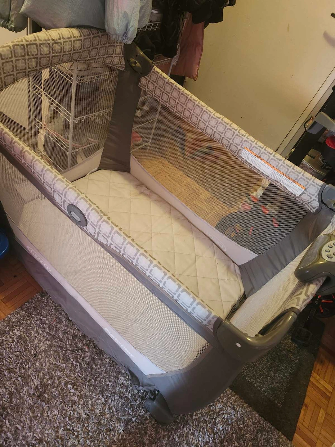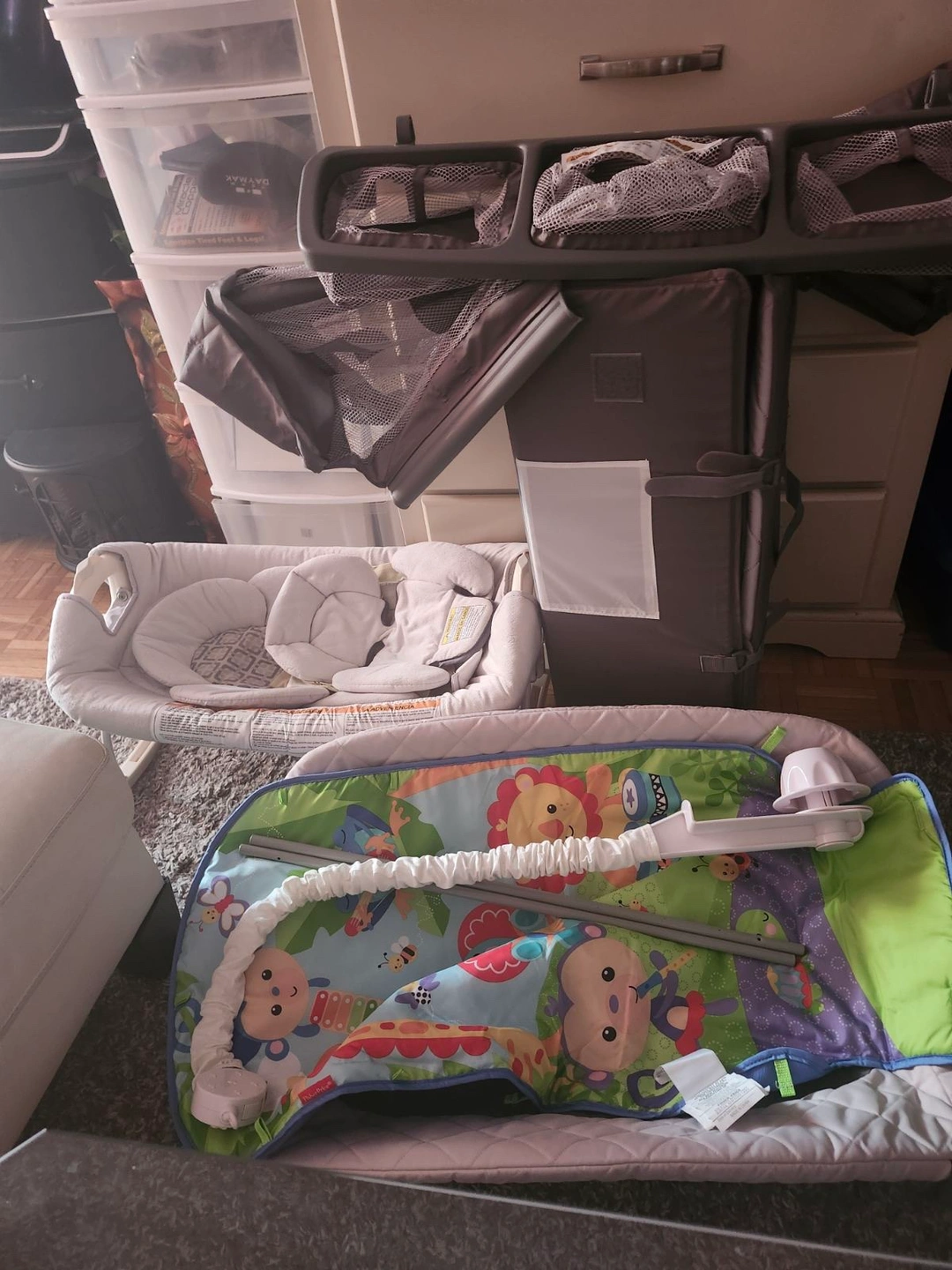 -614This playard is in good condition and includes a changing mat, bassinet, and toy bar.