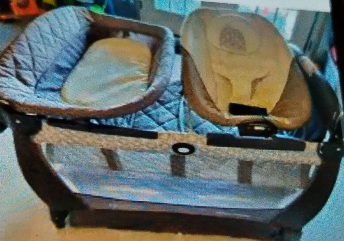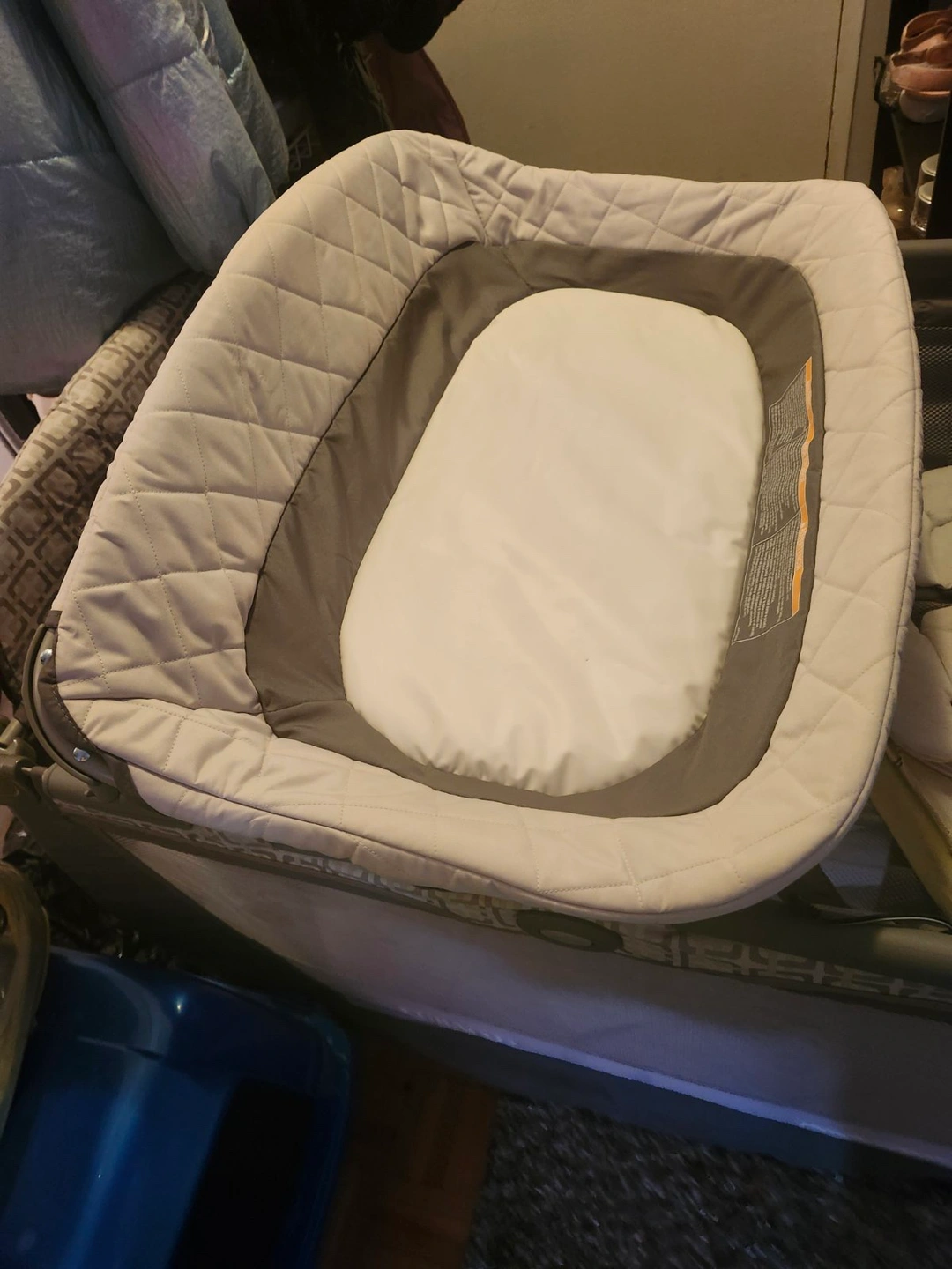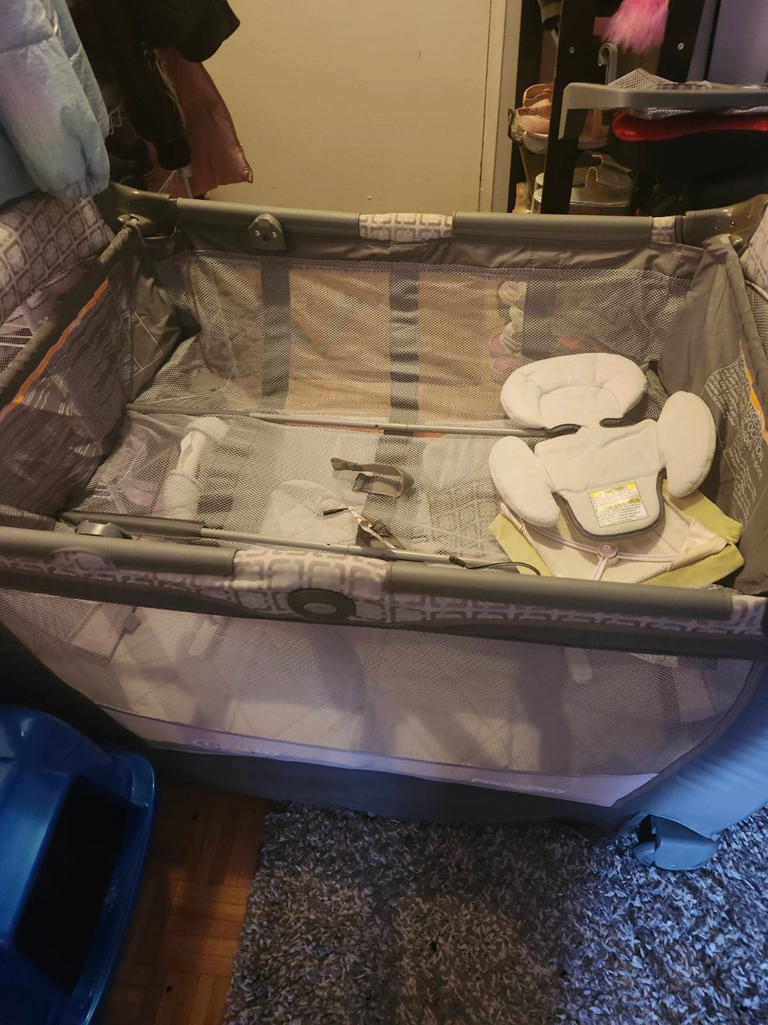 -614This playard is in good condition and includes a changing mat, bassinet, and toy bar.