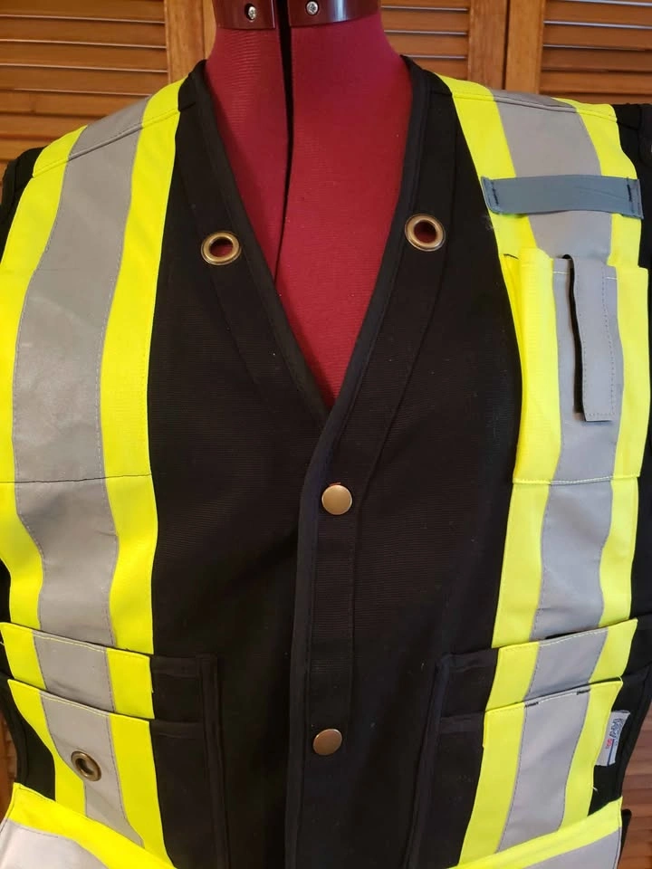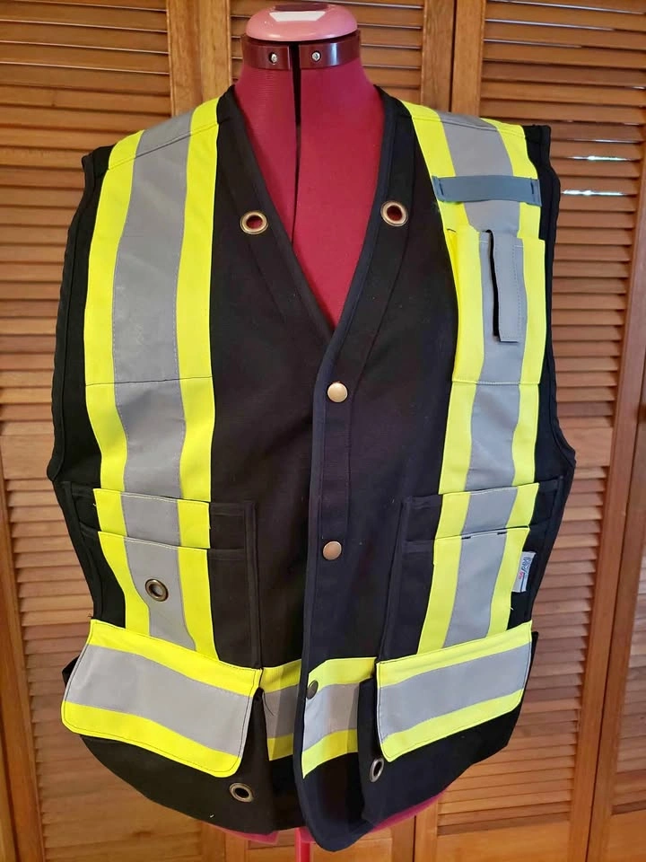 25Safety compliant surveyor's vest. 100% cotton canvas. Nice heavy weight. Snap front. Mesh side vents for breathability. Many pockets. Safety harness opening in back. Size small. 24" across center and 26.5 inches from shoulder seam to hem when laid flat.