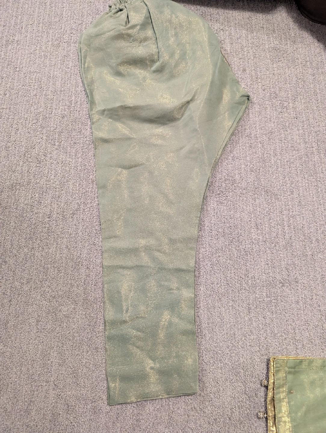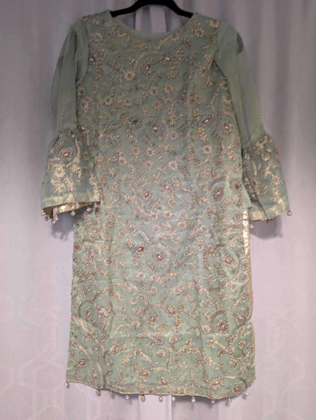 Beautiful sage green salwar kameez suit with intricate embroidery. Includes the kameez (top), salwar (pants), and dupatta (scarf). The fabric has a lovely sheen and is perfect for special occasions or celebrations. This is a gorgeous and elegant outfit!