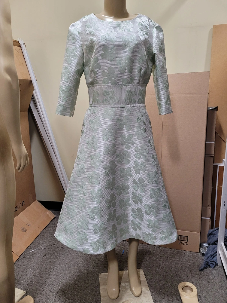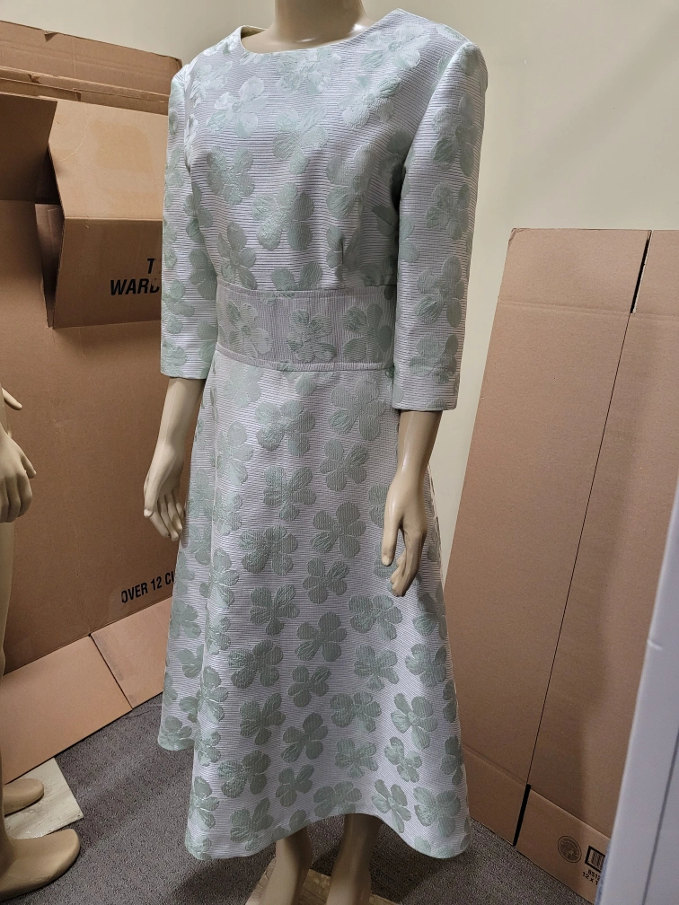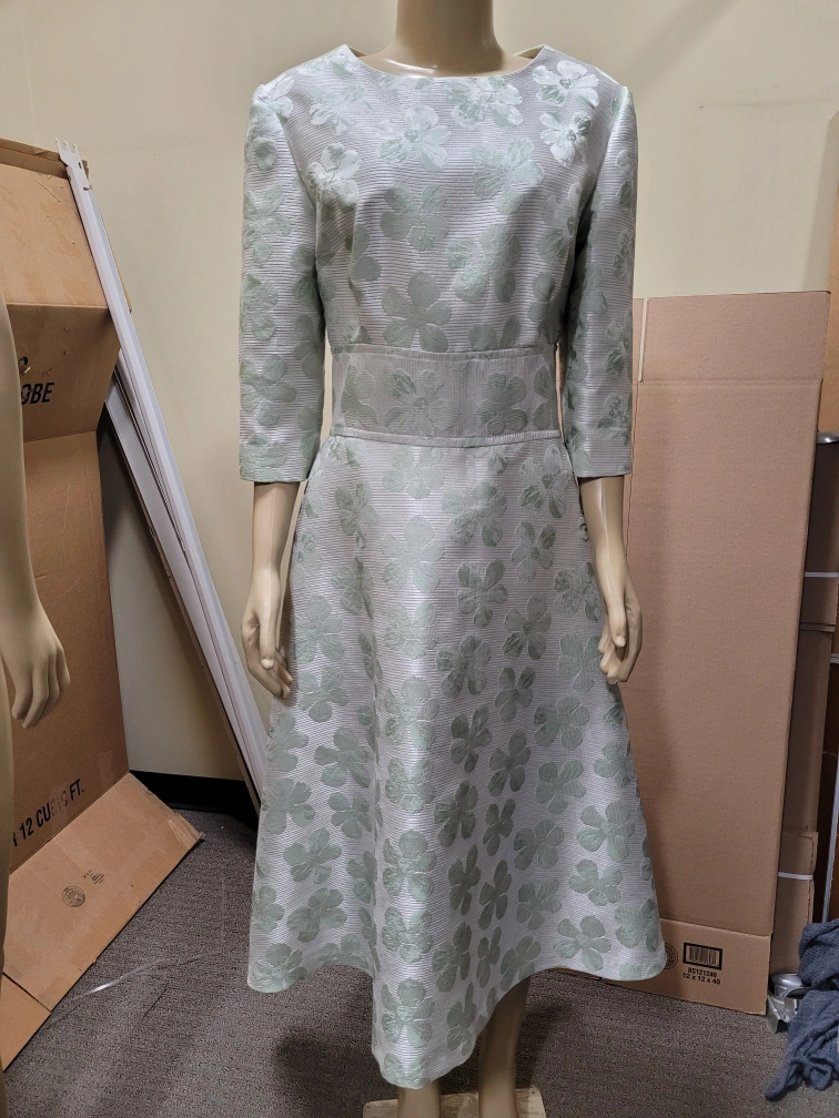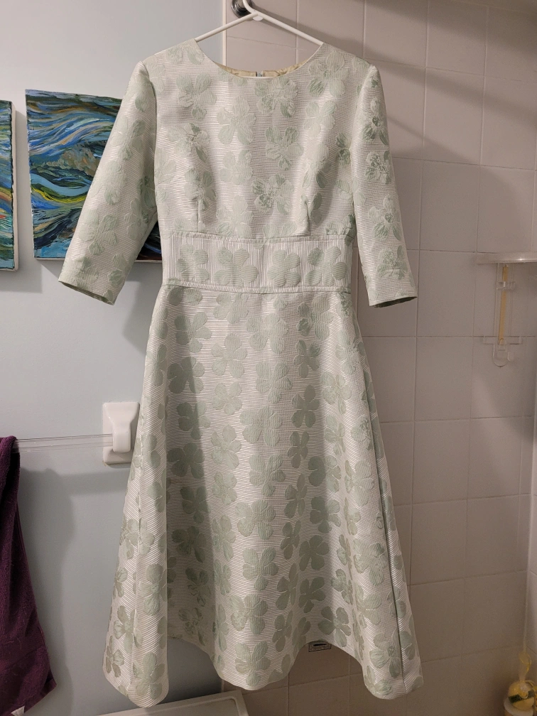 Beautiful sage green dress. Features a flattering fit and flare silhouette. Three-quarter sleeves and a round neckline. Subtle green floral pattern. Back zipper closure. The skirt stays pretty stiff and wide bell shape when on. I need to take better photos soon! It appears to be very well made. No tags. Maybe a medium size. Must pickup. Please. no etransfer or long holds. this is a cash price. bring cash. This is in storage and I will meet you there. I can access the building during 8 to 430 Monday to Friday. No one is there outside of those times.