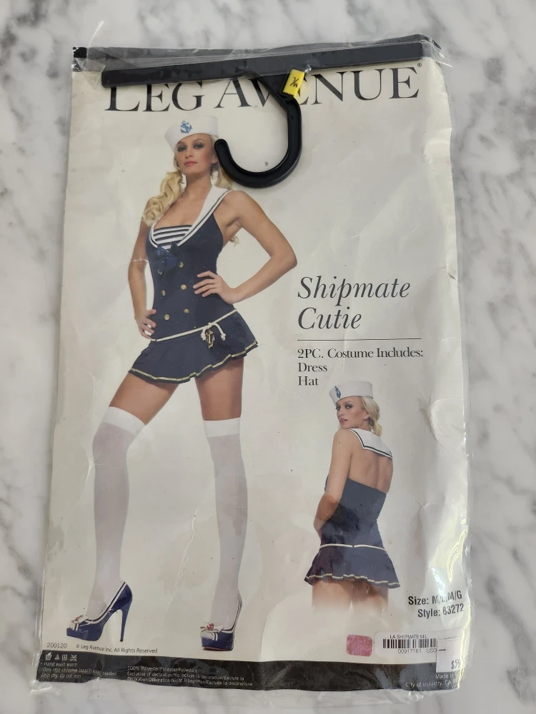 36Get ready to set sail with this adorable Leg Avenue Shipmate Cutie costume! This 2-piece set includes the dress and hat, perfect for a fun night out or a themed party. The costume is size M/L and the style number is 63272. Originally bought for $59!