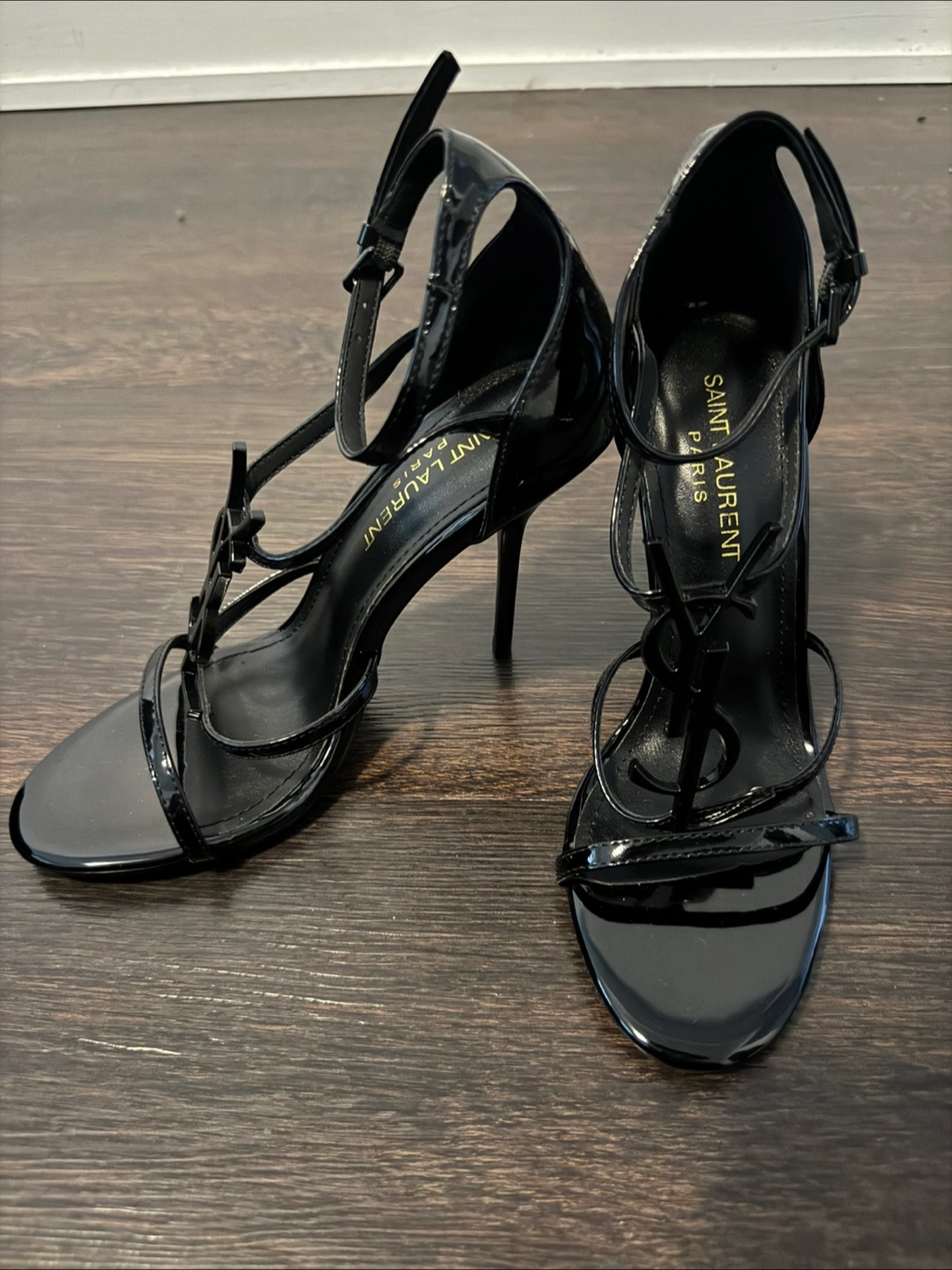 35BRAND NEW NEVER WORN Elegant black patent leather high heels. YSL logo detail. Ankle strap closure. Stiletto heels. Excellent for evening wear. Size 35