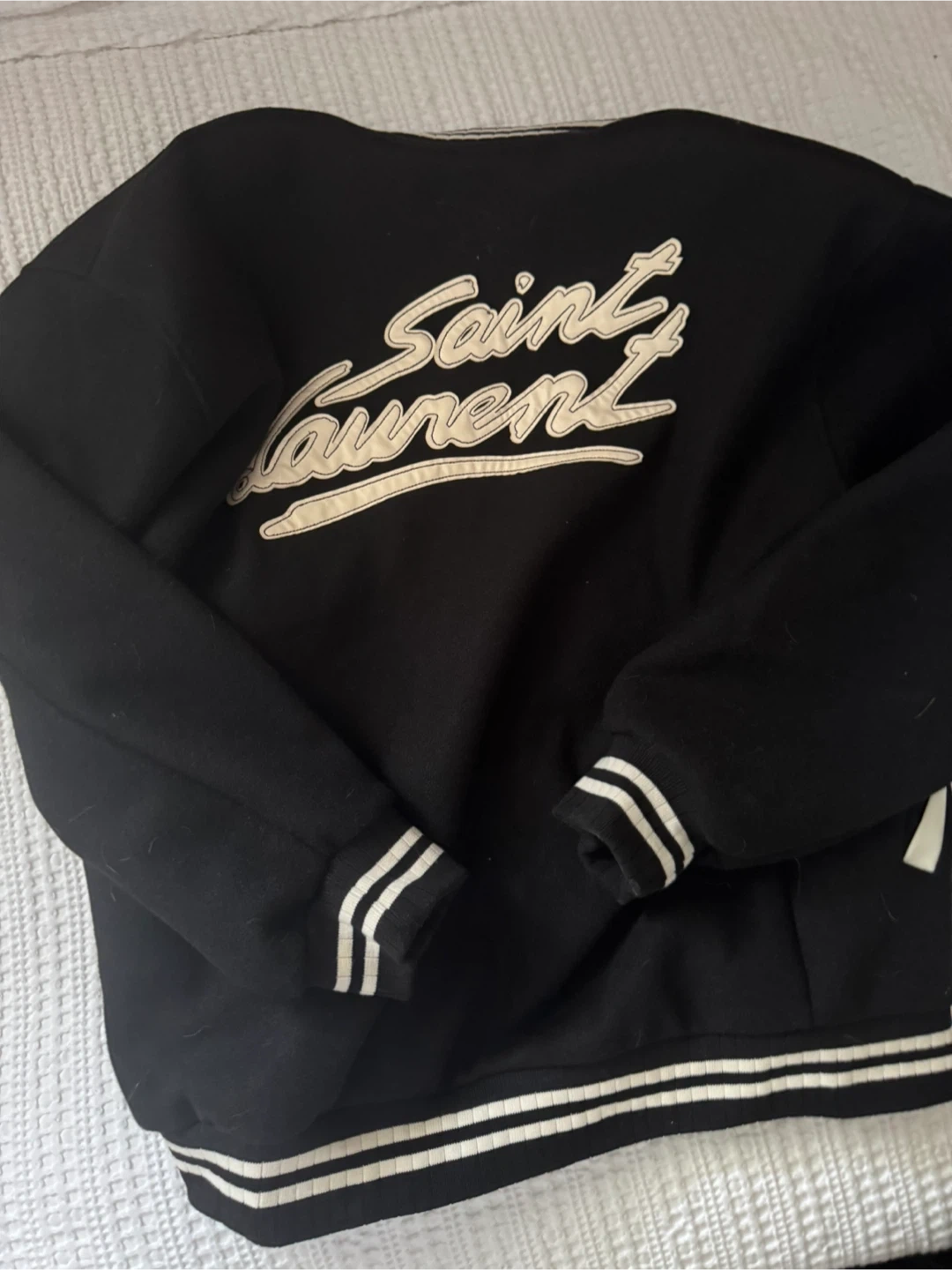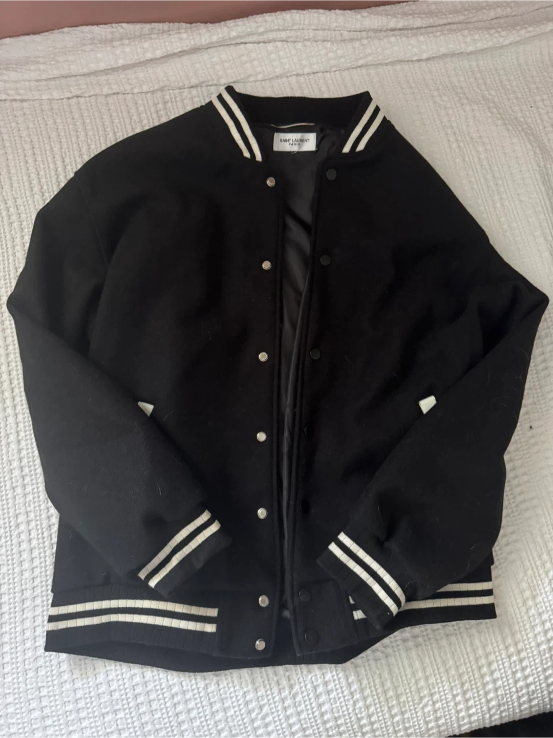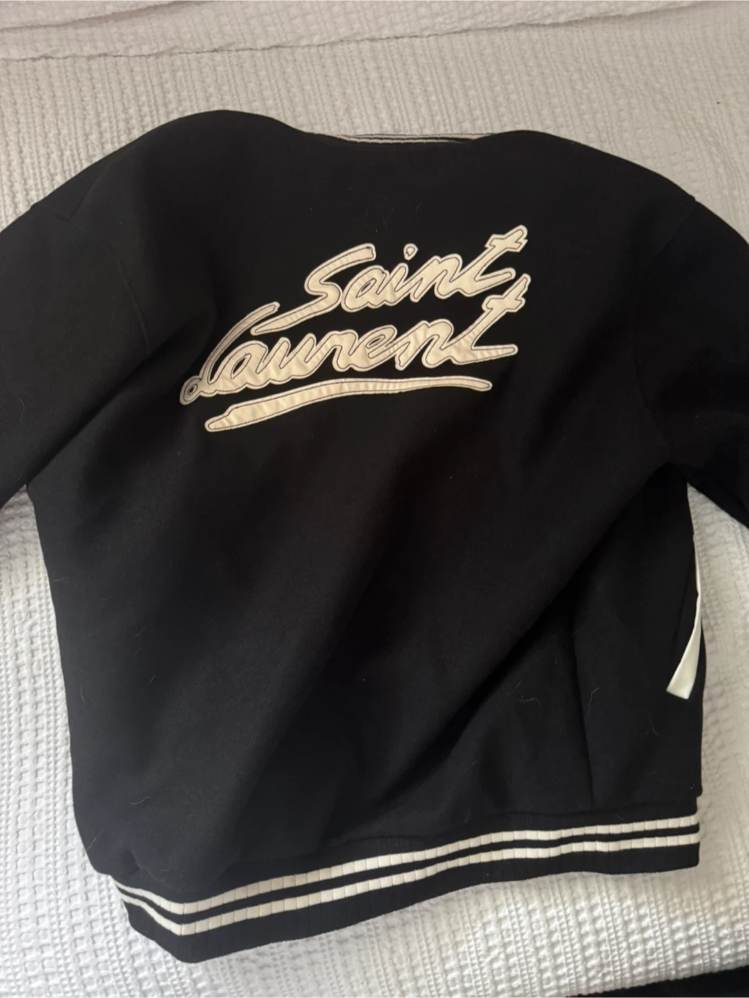 70Selling a Saint Laurent varsity jacket in black. It's in great condition and ready for a new home! The jacket features the brand's name embroidered on the back, adding a touch of luxury to this classic style