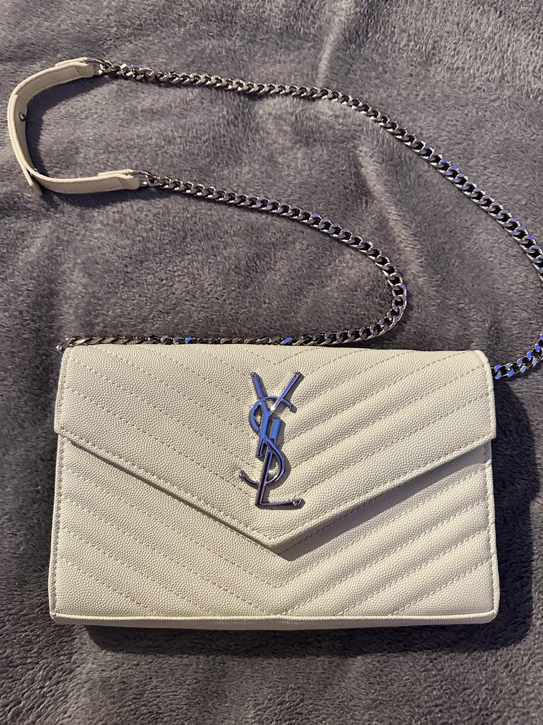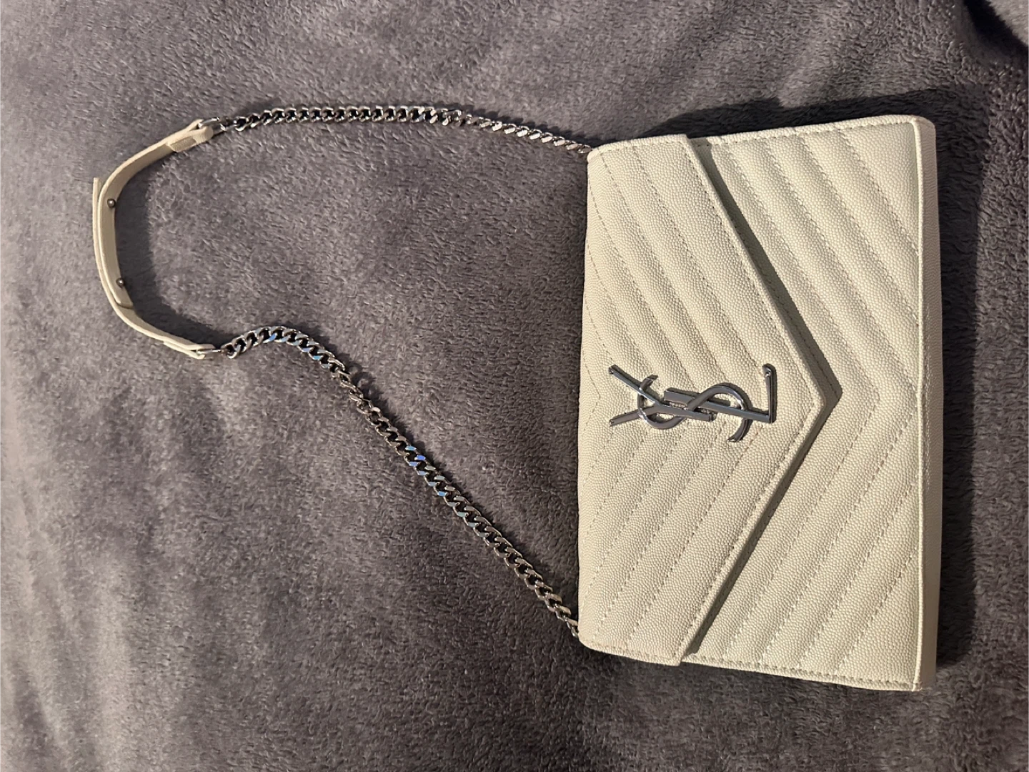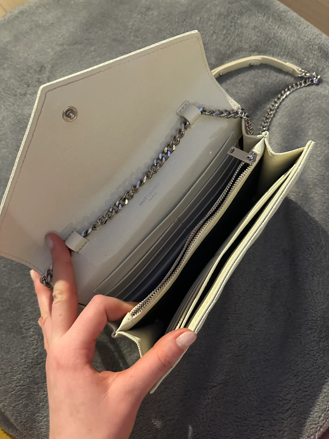 15Selling a beautiful Saint Laurent chain wallet in off-white. It's in great condition and perfect for carrying your essentials in style. The chain adds a touch of elegance, making it suitable for both day and night outings It is a doup but in great condition.