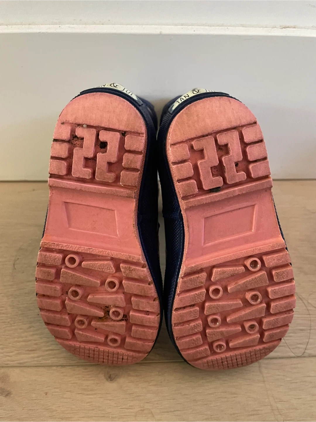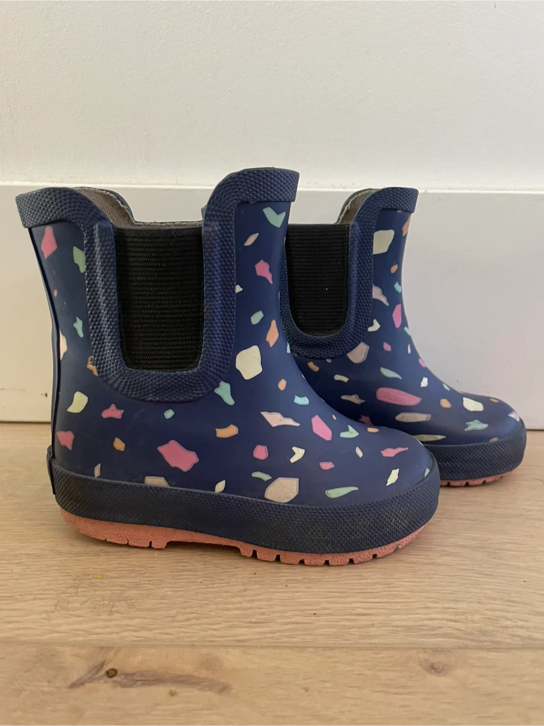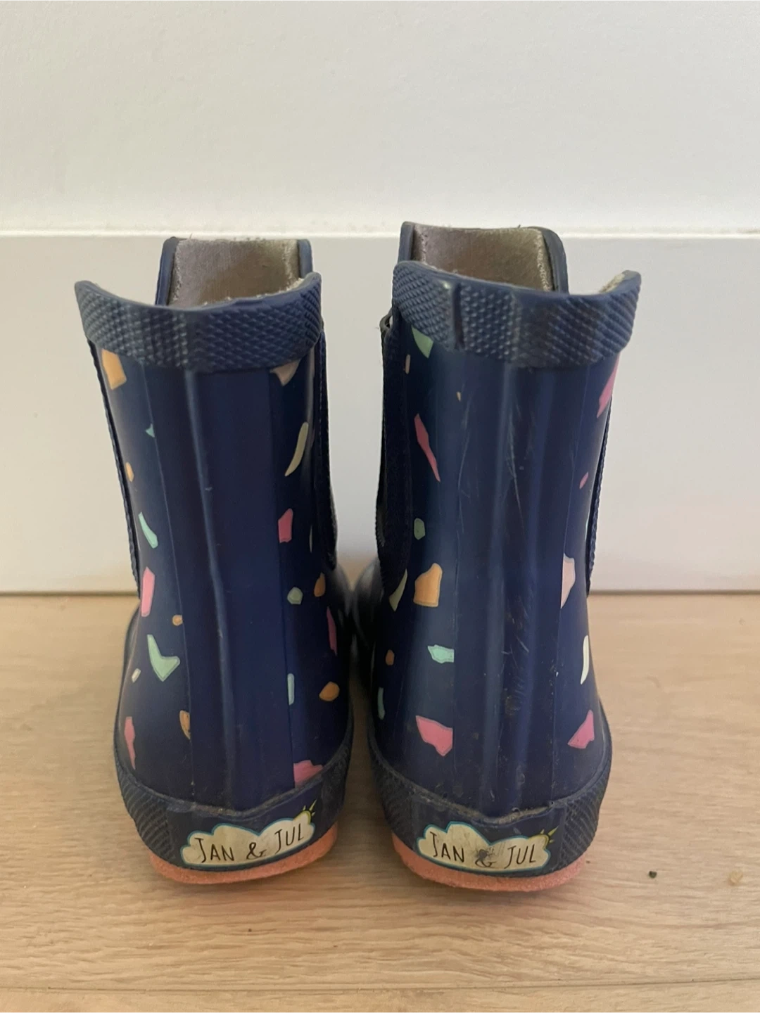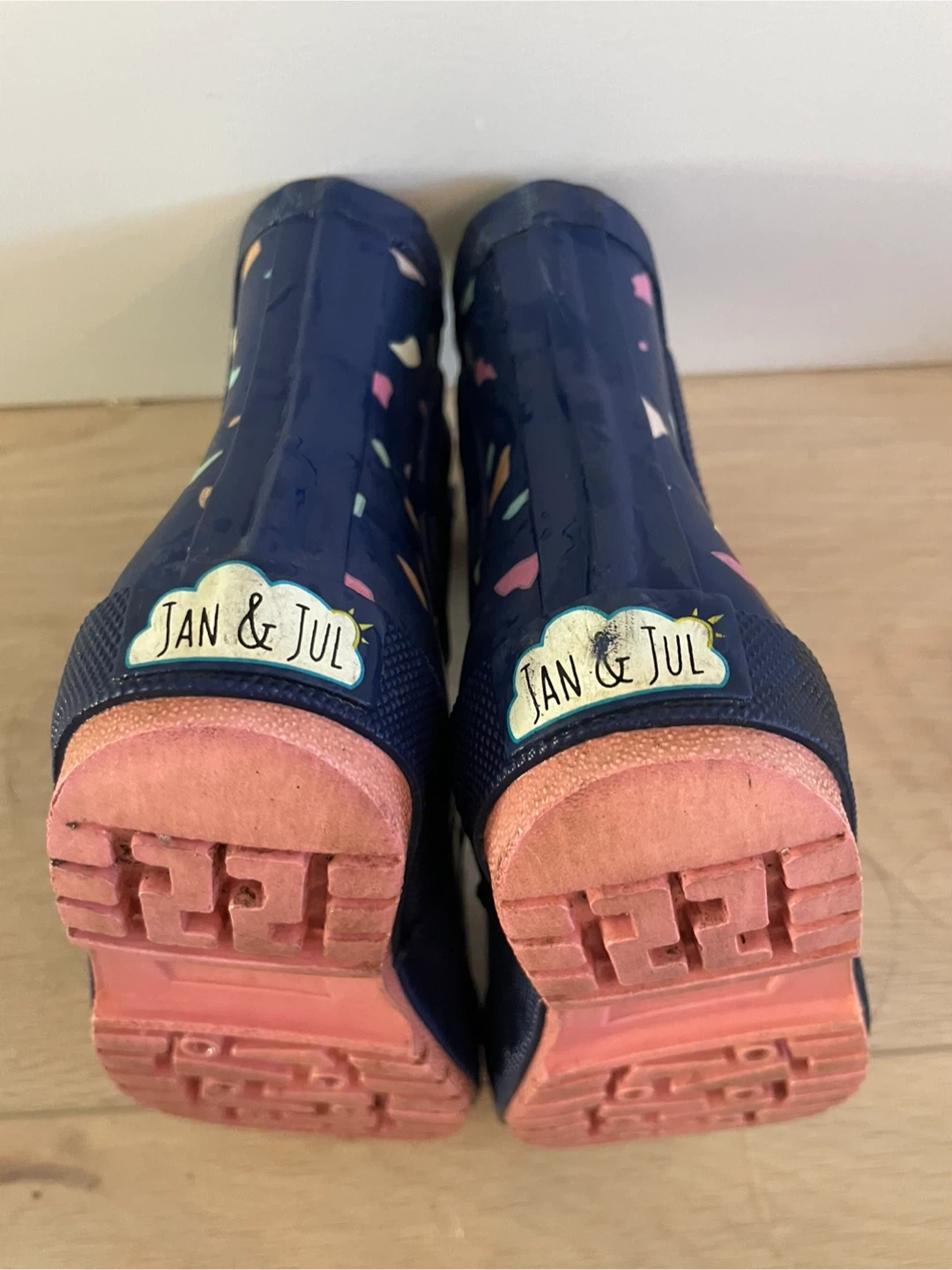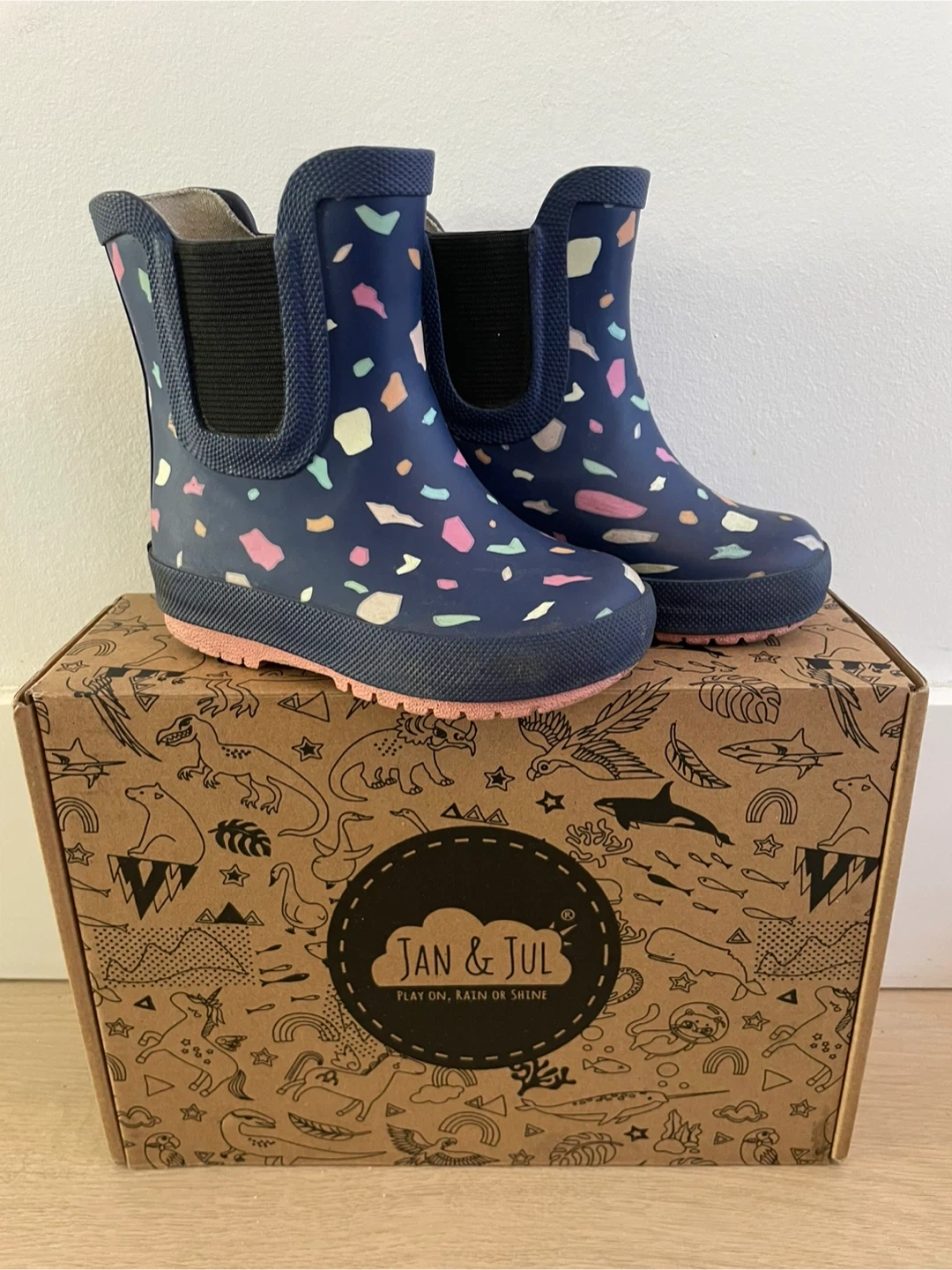 These Jan & Jul rain boots are perfect for keeping little feet dry and stylish. They feature a fun confetti pattern on a navy blue background with pink soles.