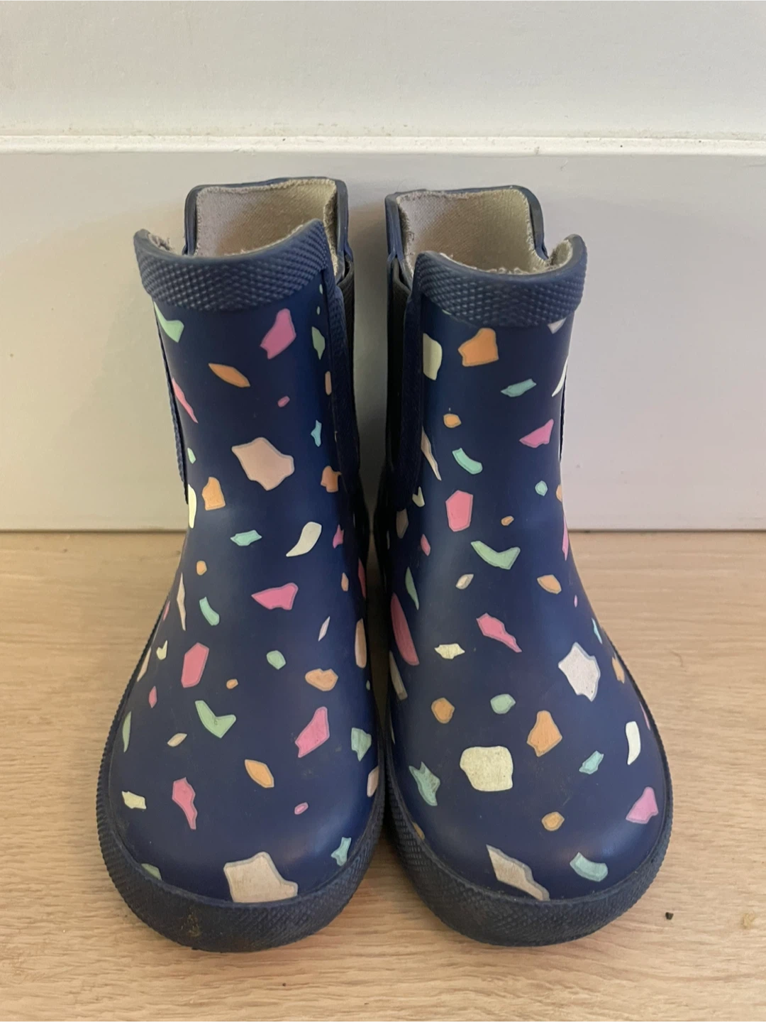These Jan & Jul rain boots are perfect for keeping little feet dry and stylish. They feature a fun confetti pattern on a navy blue background with pink soles.