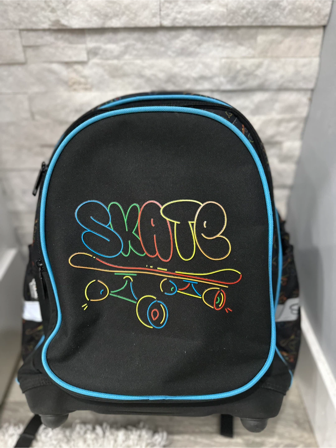 This black backpack features a colourful "SKATE" graphic with a skateboard. It has adjustable padded straps and a durable design. Perfect for carrying school supplies or gear for a day out!