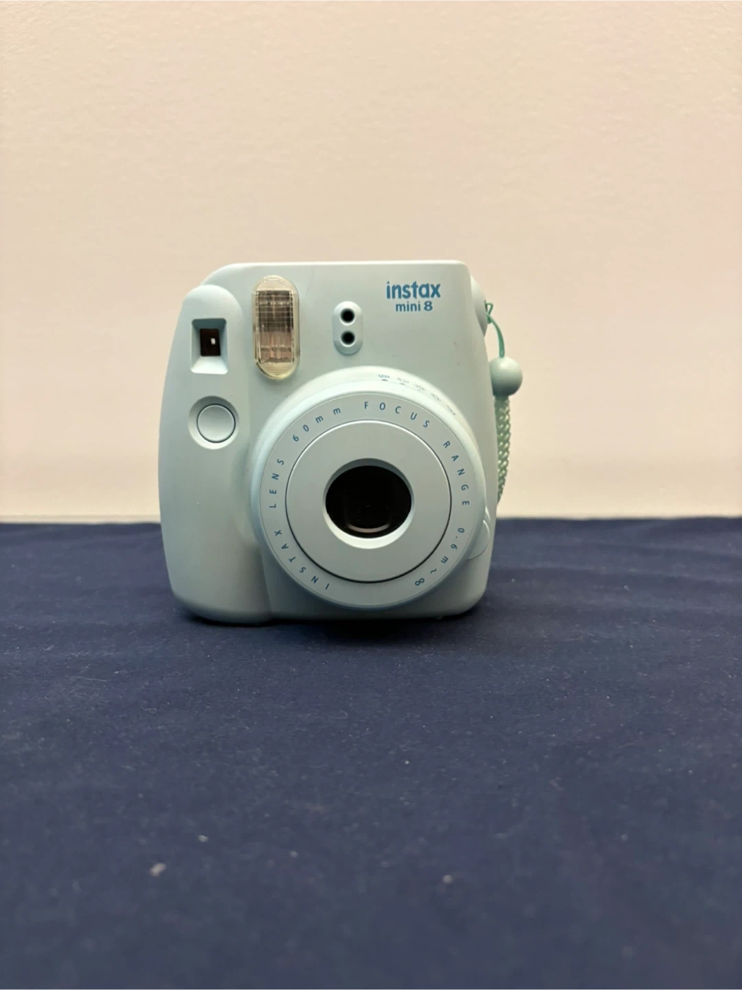This is a Fujifilm Instax Mini 8 instant camera in light blue. It features a 60mm lens with a focus range of 0.6m to infinity. Perfect for capturing memories on the go it is $70 dollars and it is very new no problem either it but it will unfortunately not come with batteries