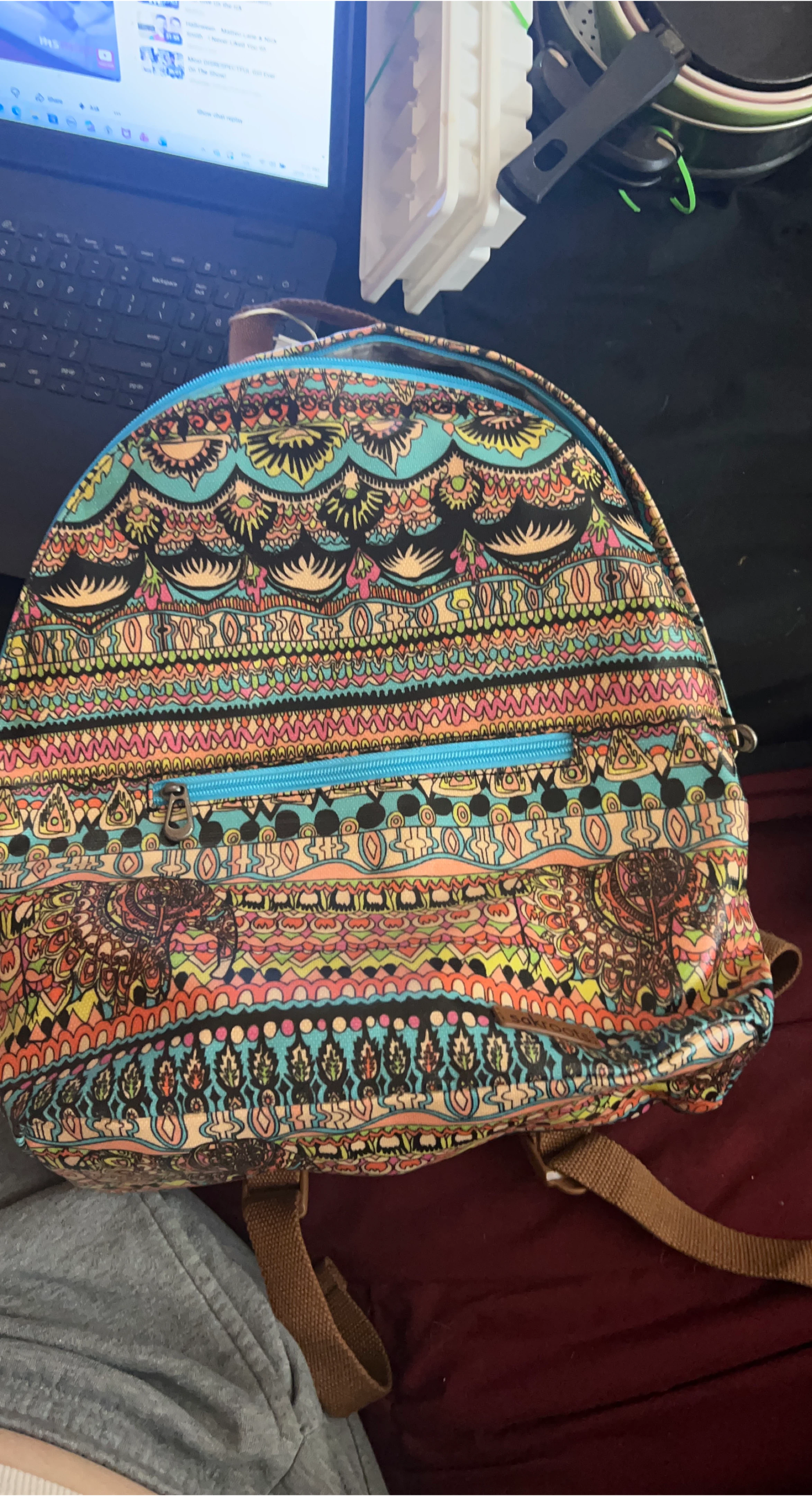 5This Sakroots backpack features a vibrant and colourful design with a blue zipper. It's perfect for carrying your essentials in style!