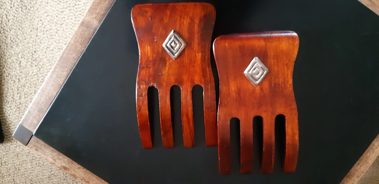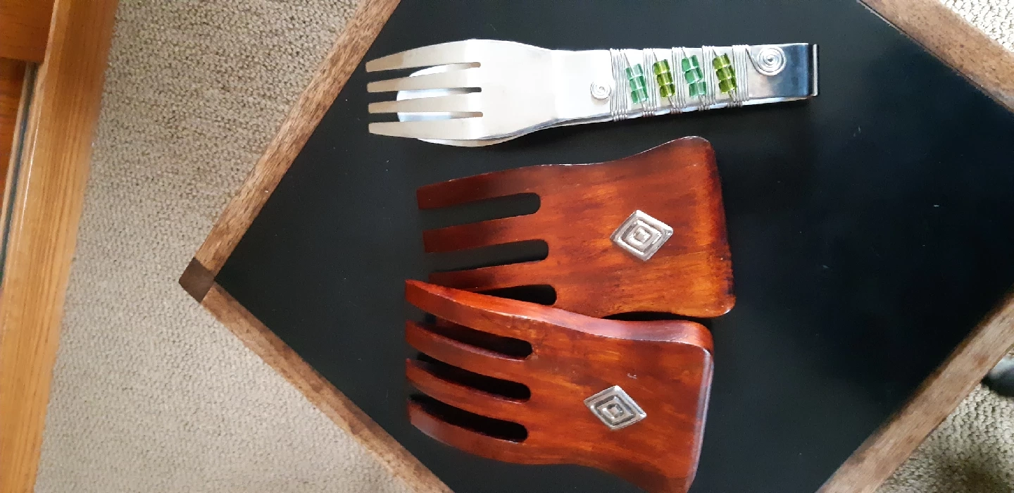 828Heres a great set of salad servers! 1.Unique stainless steel tongs with beaded handle (for salad, etc) 2. A pair of solid wood salad servers with metal accents