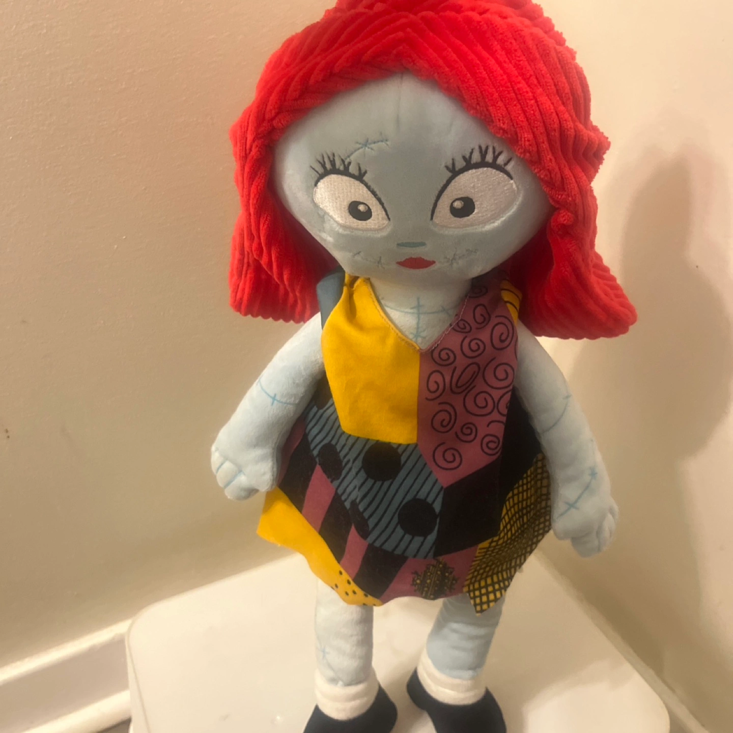 369Adorable Sally plush doll. Features red hair, a patchwork dress, and embroidered details. Great for collectors or fans of the movie.