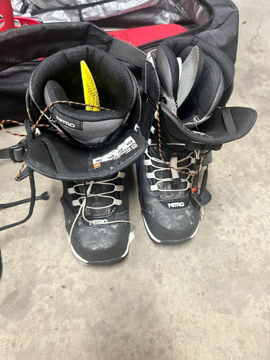 10Selling a complete snowboard set! Included is a Salomon 'Classiques' 154 snowboard with bindings, a pair of size US 8.0 Nitro snowboard boots, and a helmet. Perfect for hitting the slopes this winter!