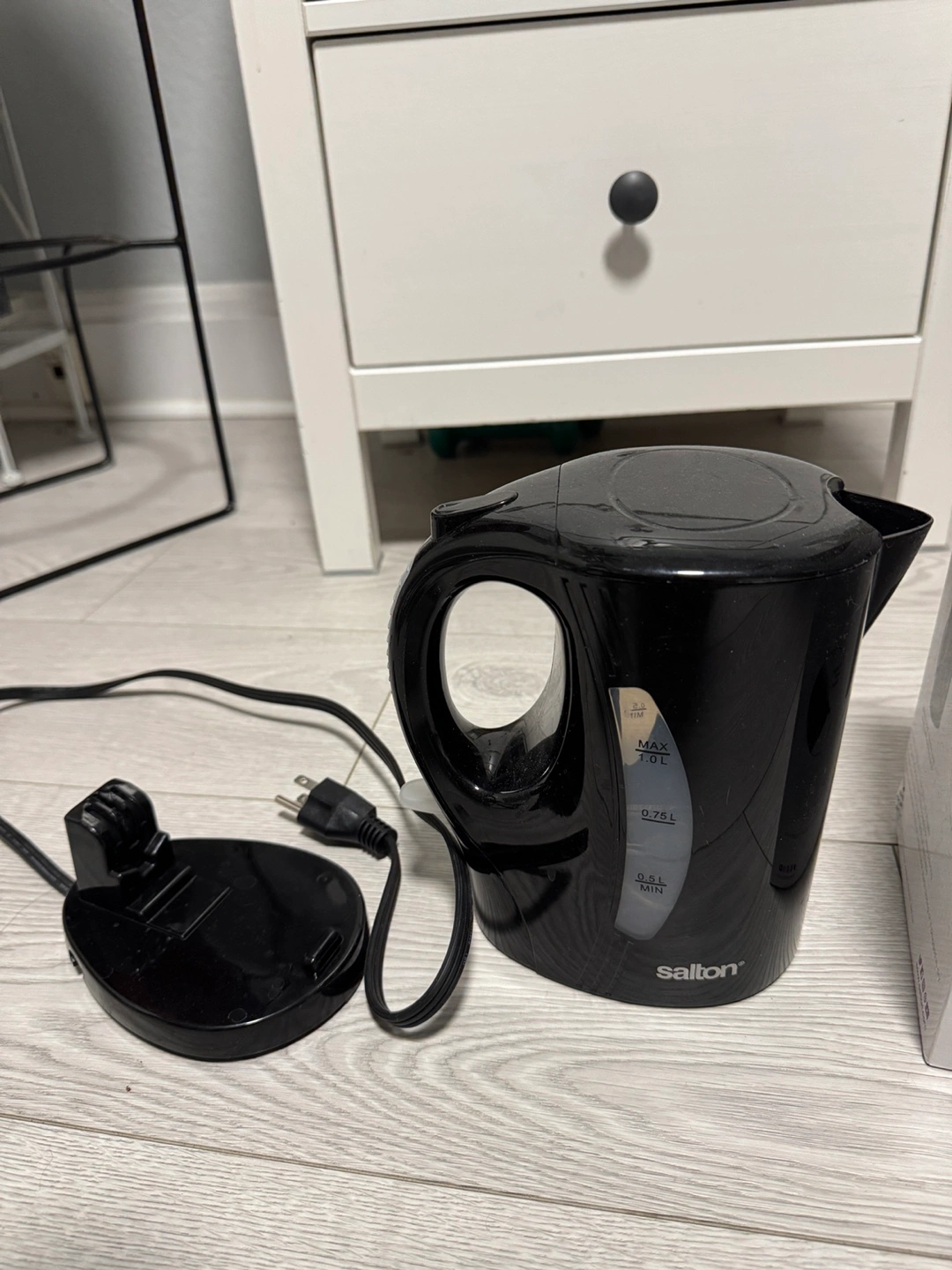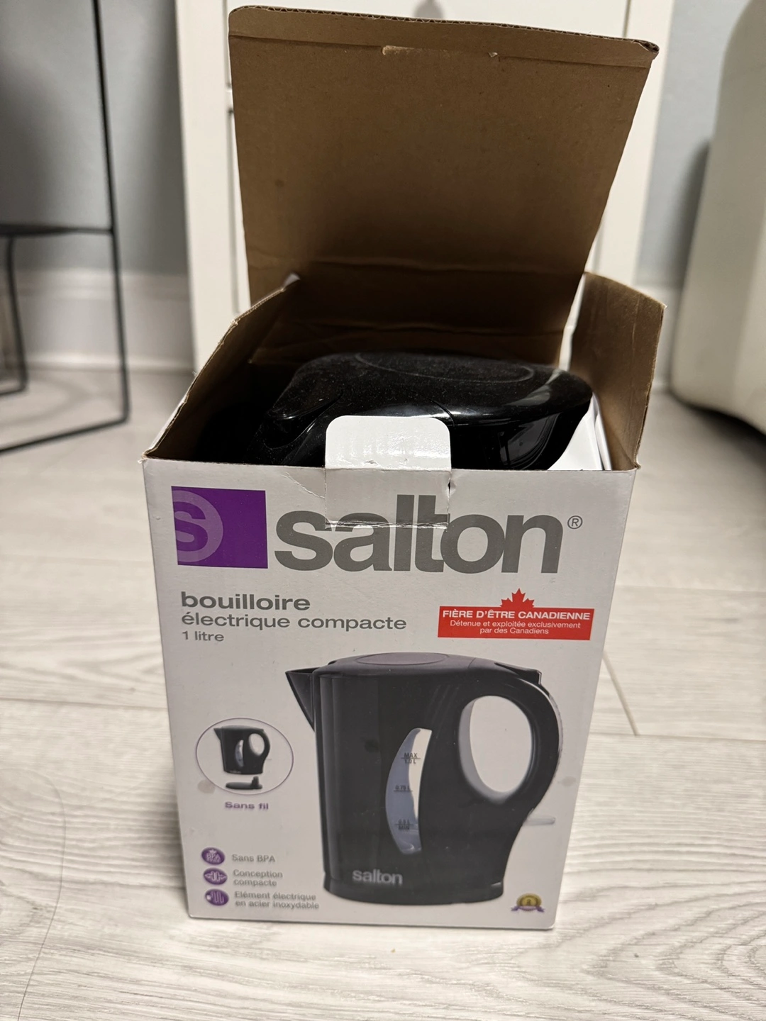 Salton compact electric kettle. One litre capacity. Cordless design. BPA-free. Includes base and power cord. Perfect for small spaces. It’s only been used for 3-4 months. ( international student went back to her country) I can deliver to you, meet at subway station Or you can pick it up at Kipling station
