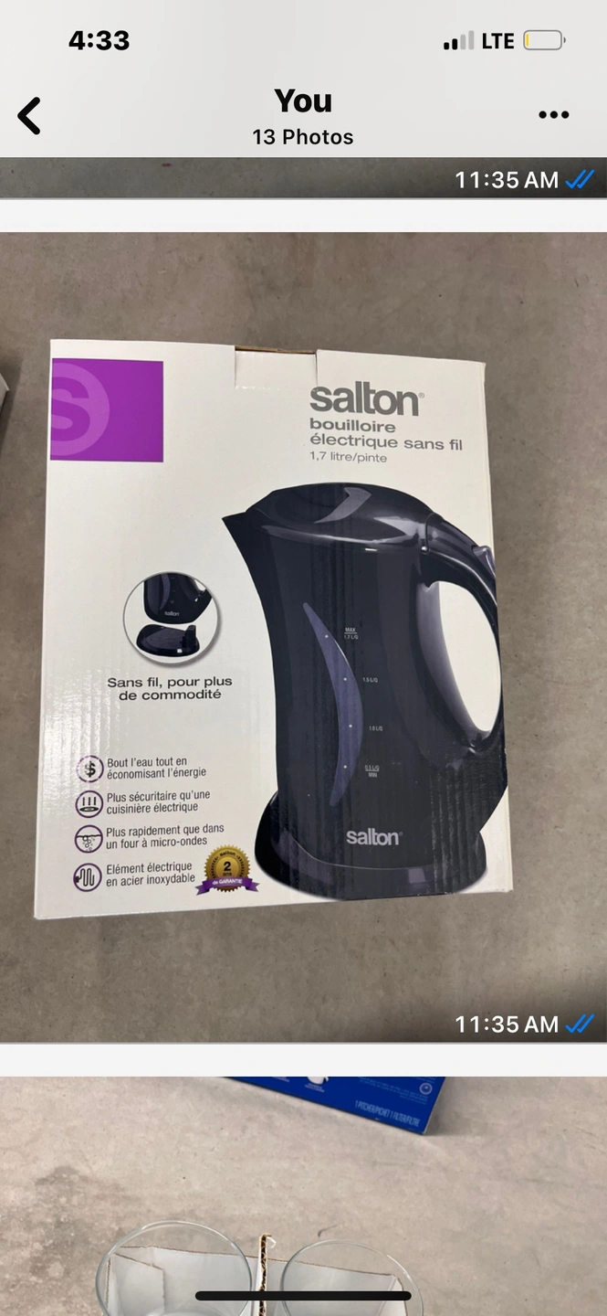 New in box, 1.7L capacity. Features include a stainless steel heating element and a 360 degree base. Pickup Tuesday!!
