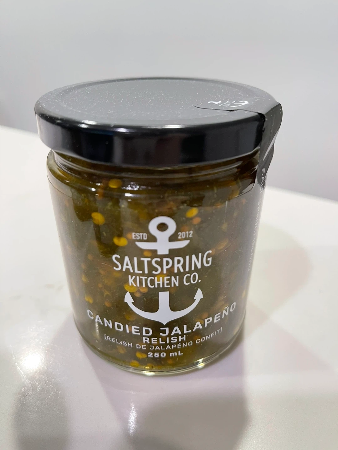 99New. Selling a jar of Candied Jalapeno Relish from Saltspring Kitchen Co! This relish comes in a 250 mL jar and is handmade on Salt Spring Island. The expiration date is 2026 October 02