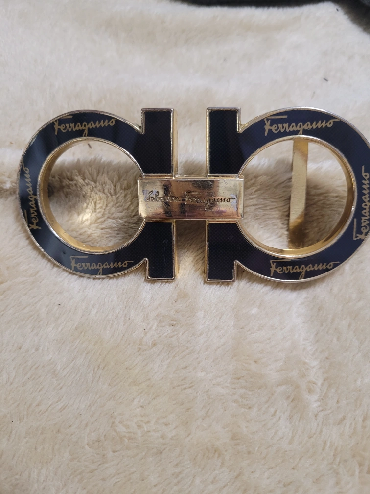 Gold-tone metal buckle. Black enamel inlay. Designer label visible. Pre-owned.