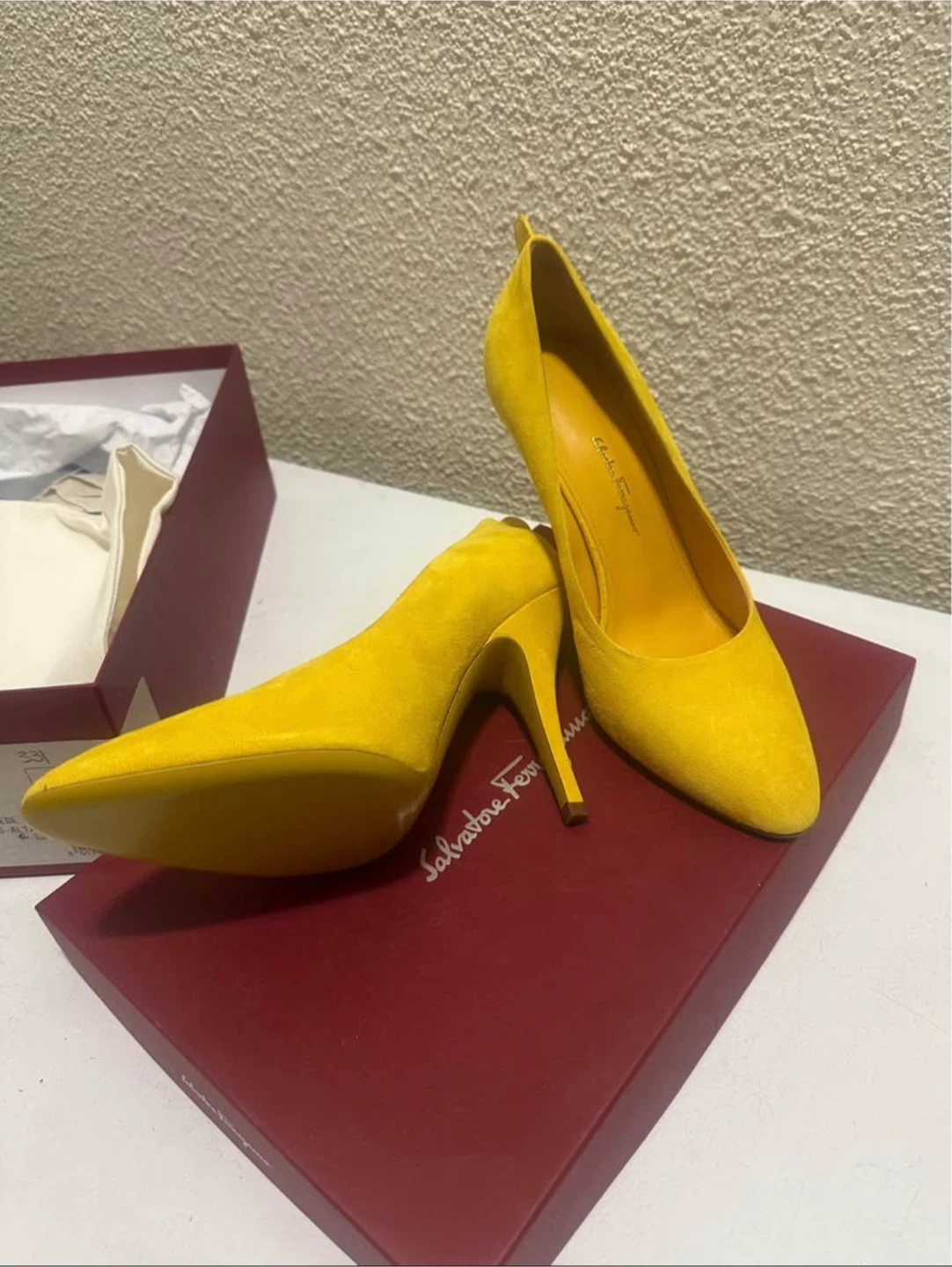 Selling a pair of Salvatore Ferragamo Judy X5 heels in a vibrant yellow suede. These heels are a size 9.5. The box is included!