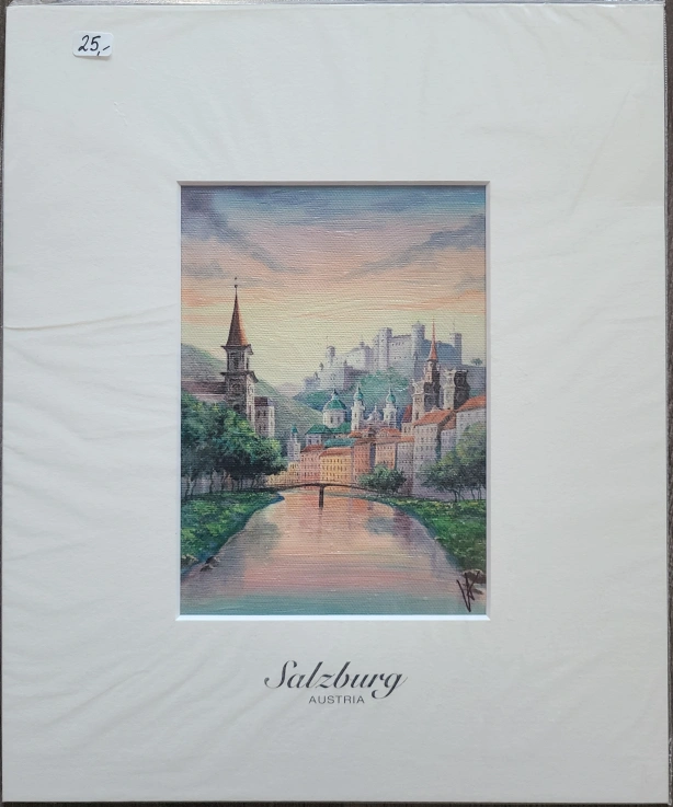 76The image is a painting of Salzburg, Austria. It depicts a view of the city center with the Salzach River flowing through it, and the Hohensalzburg Fortress visible on the hill in the background. * not framed * Dimensions: 12cm x 21cm Pick up only. No delivery.