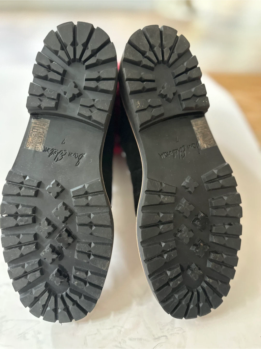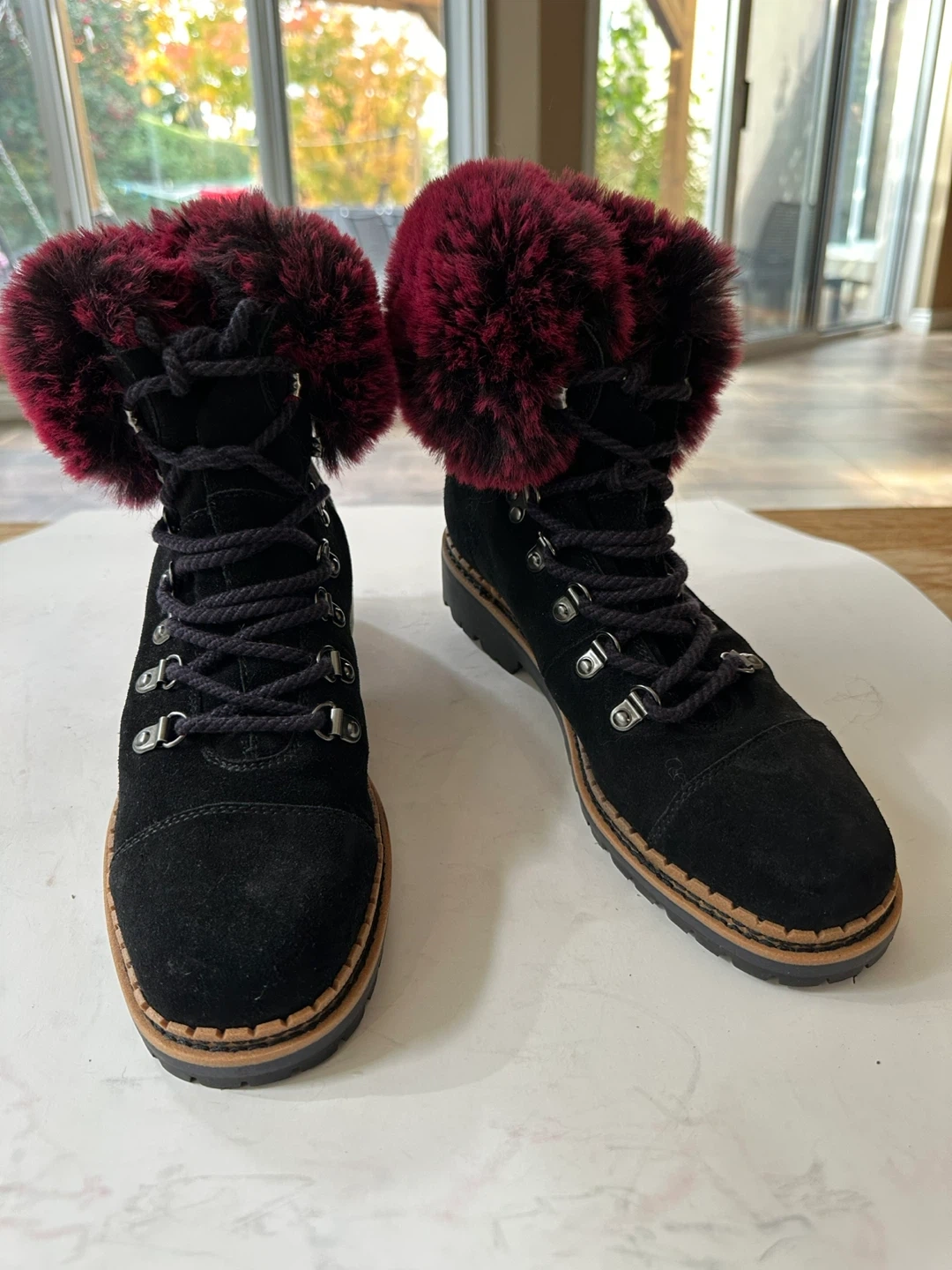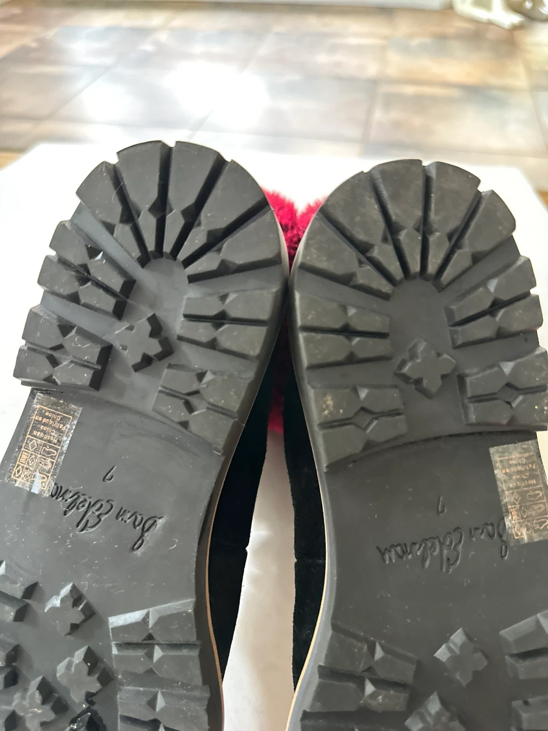 65LIKE NEW !! Worn once ! These Sam Edelman boots are a stylish addition to any wardrobe! They feature a black suede exterior with a unique red faux fur trim and rugged soles. Size 7 These shoes have been meticulously cleaned and sanitized. From a smoke free, pet free home. Pick up in Alta Vista.