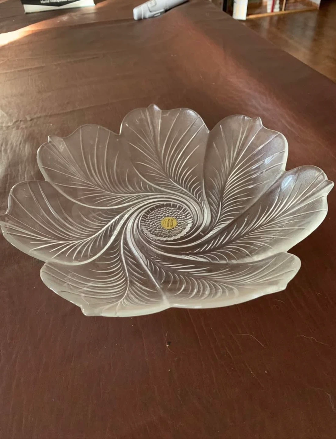 Crystal d’Arque glass bowl features a beautiful floral design with etched details. It's perfect for serving snacks or as a decorative piece.