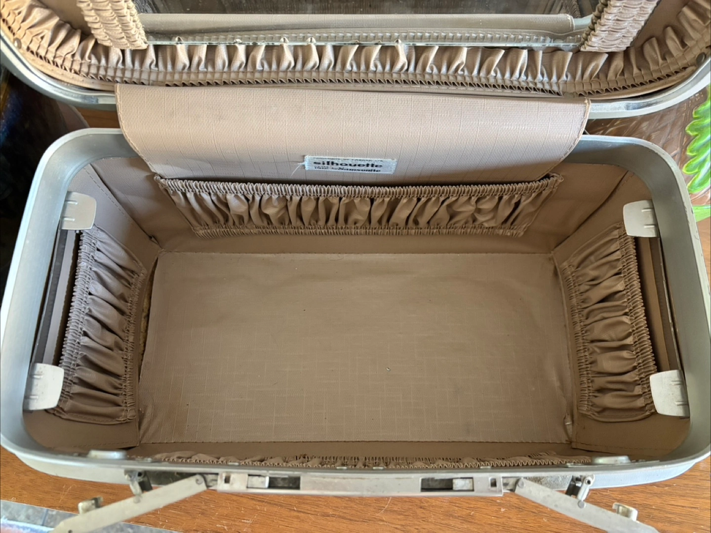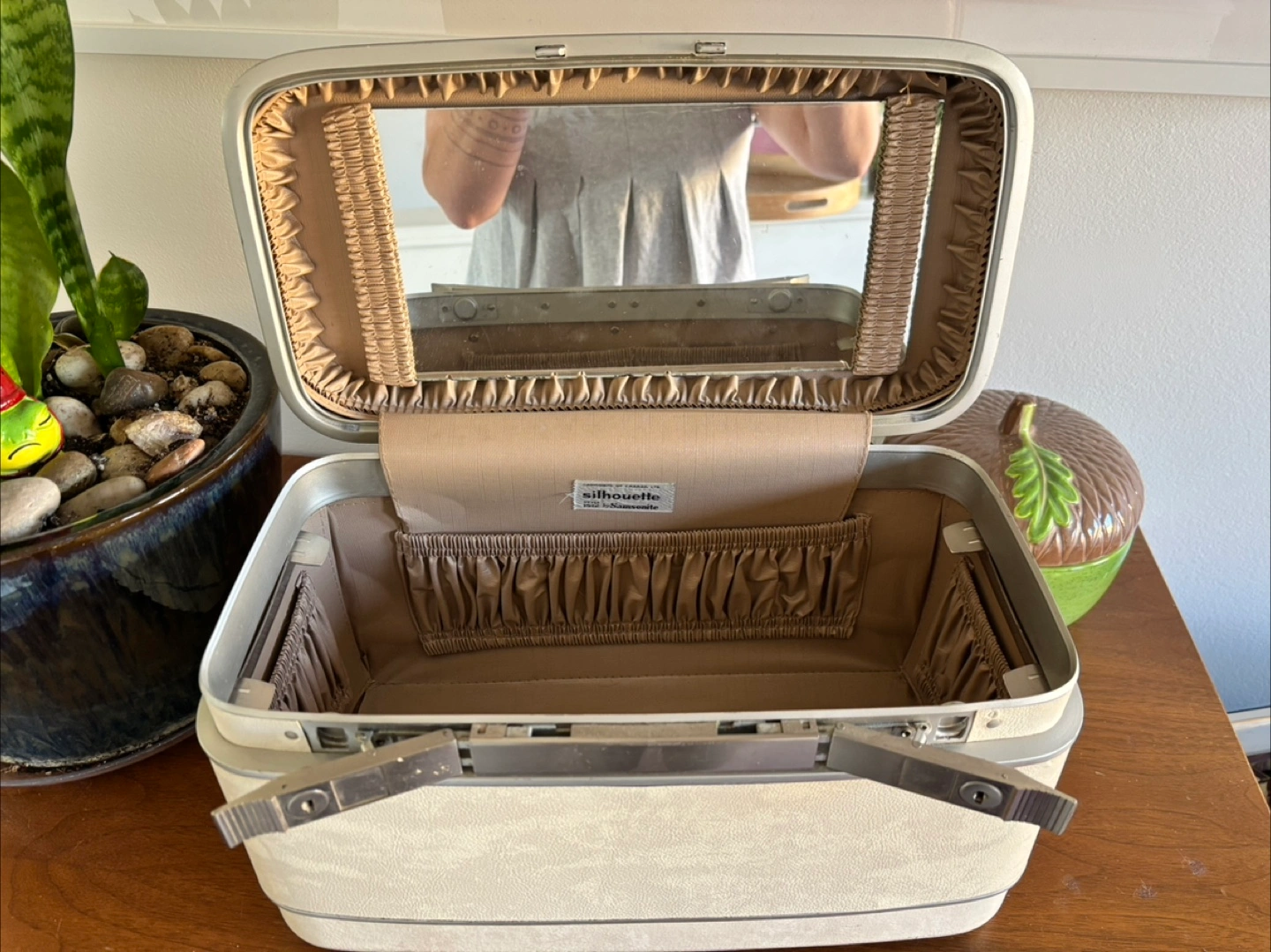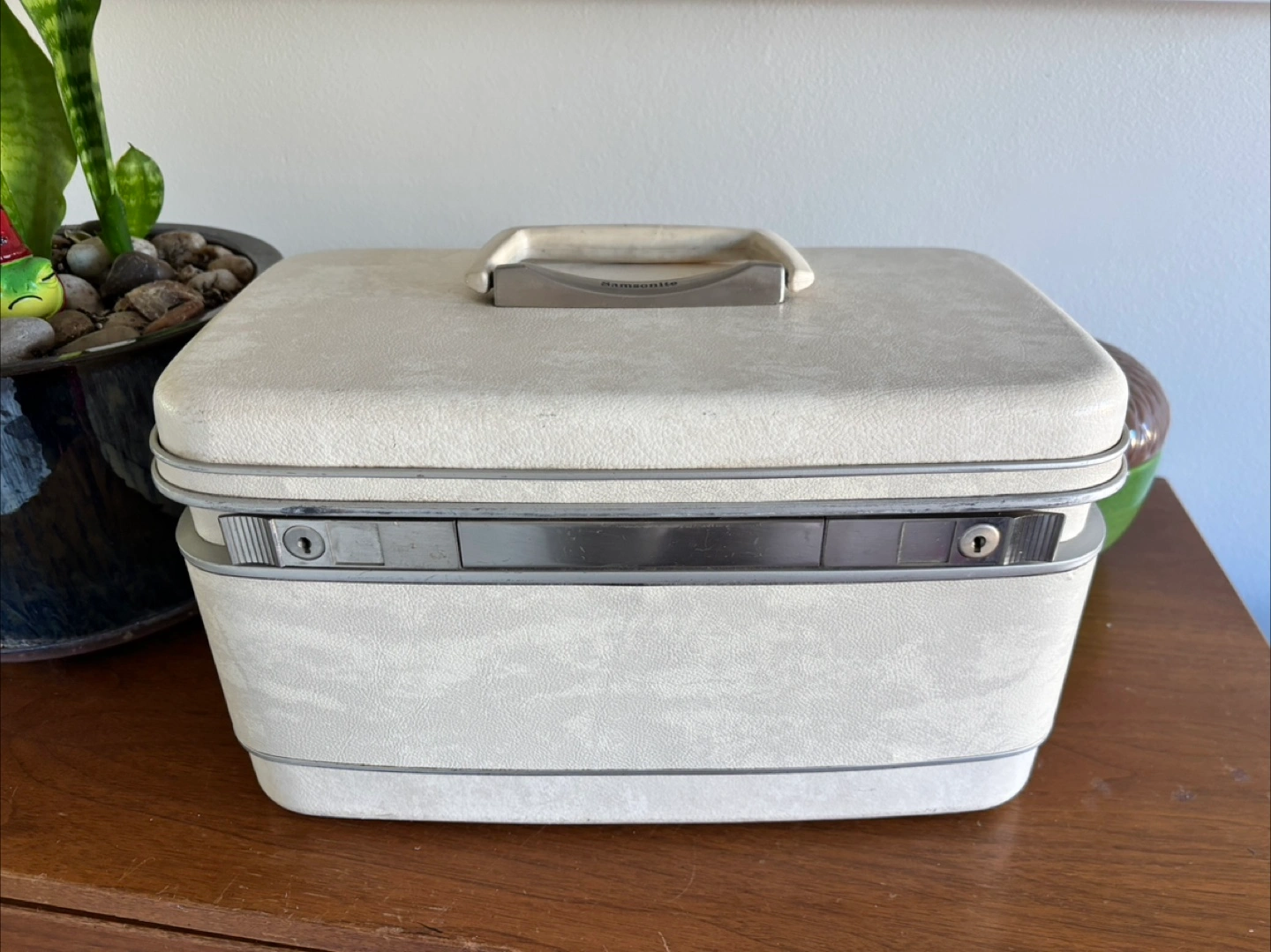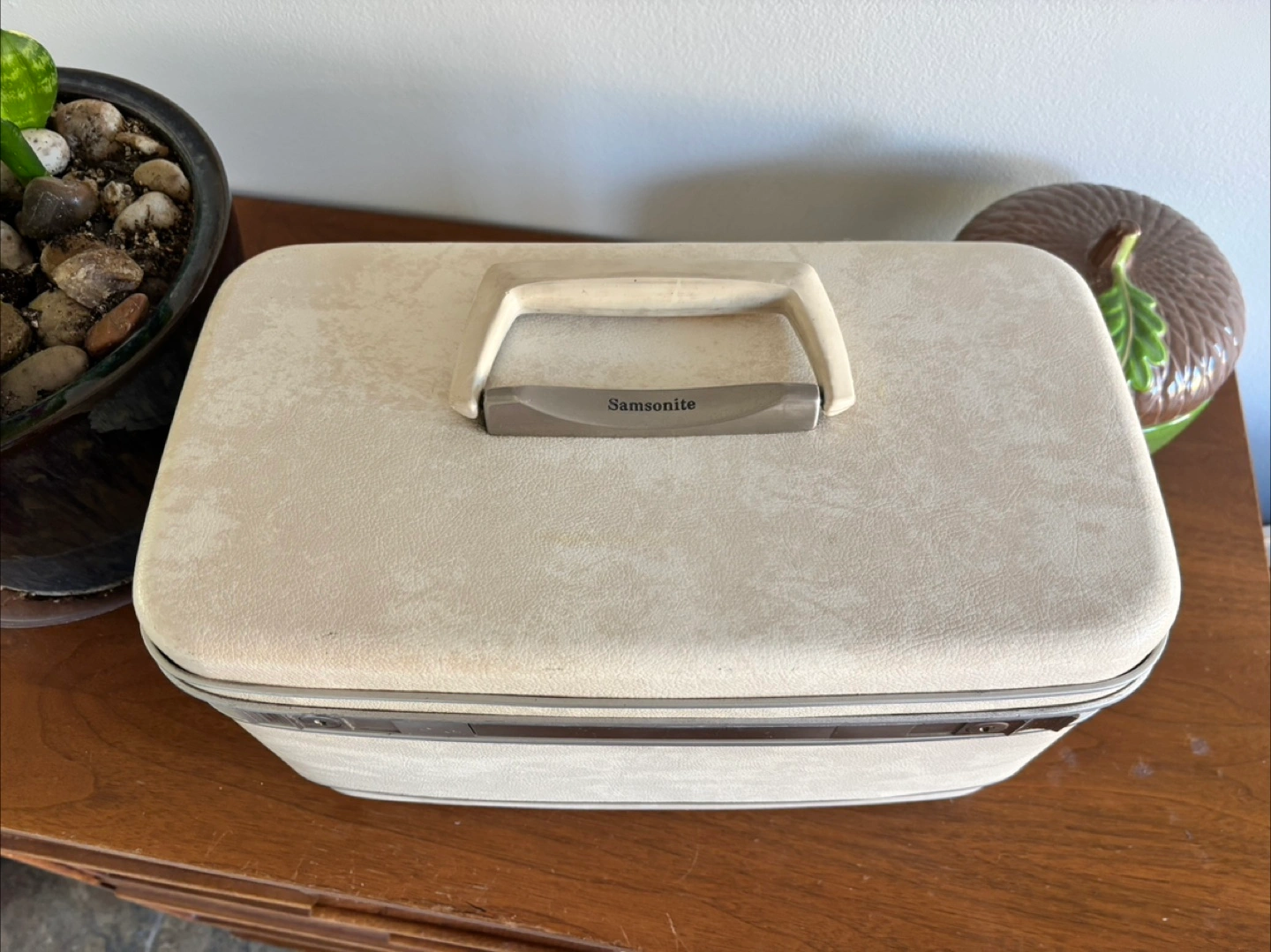 Selling a vintage Samsonite Silhouette beauty case. It's in good condition for its age and perfect for storing your cosmetics or using as a unique travel accessory. The interior features a mirror and organizational pockets.