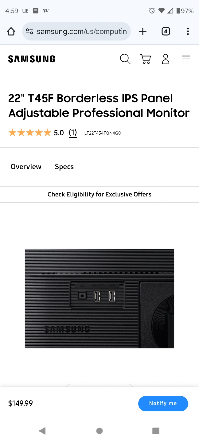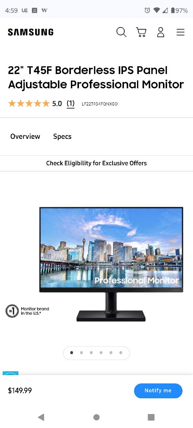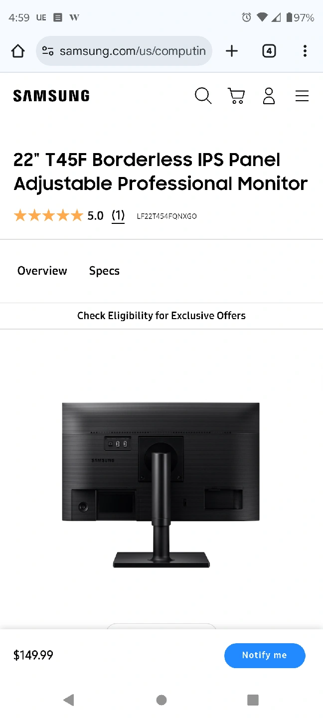 76Selling a Samsung 22" T45F Borderless IPS Panel Adjustable Professional Monitor! It has a 1,920 x 1,080 resolution and a 75Hz refresh rate. The display type is IPS and it has a brightness of 250 nits. Great for working from home or gaming! new Unused for complete specs, see below: https://www.samsung.com/us/computing/monitors/flat/ft45-series-22-lf22t454fqnxgo/