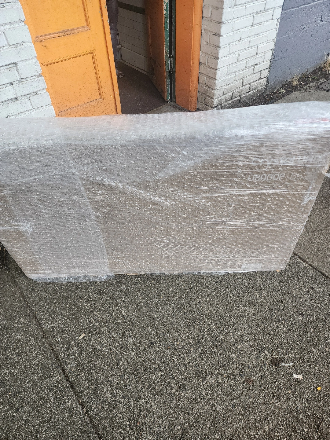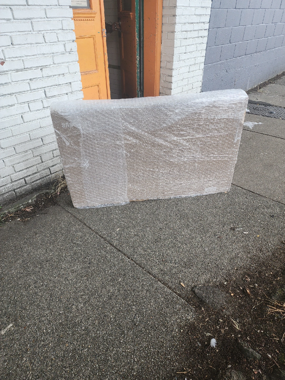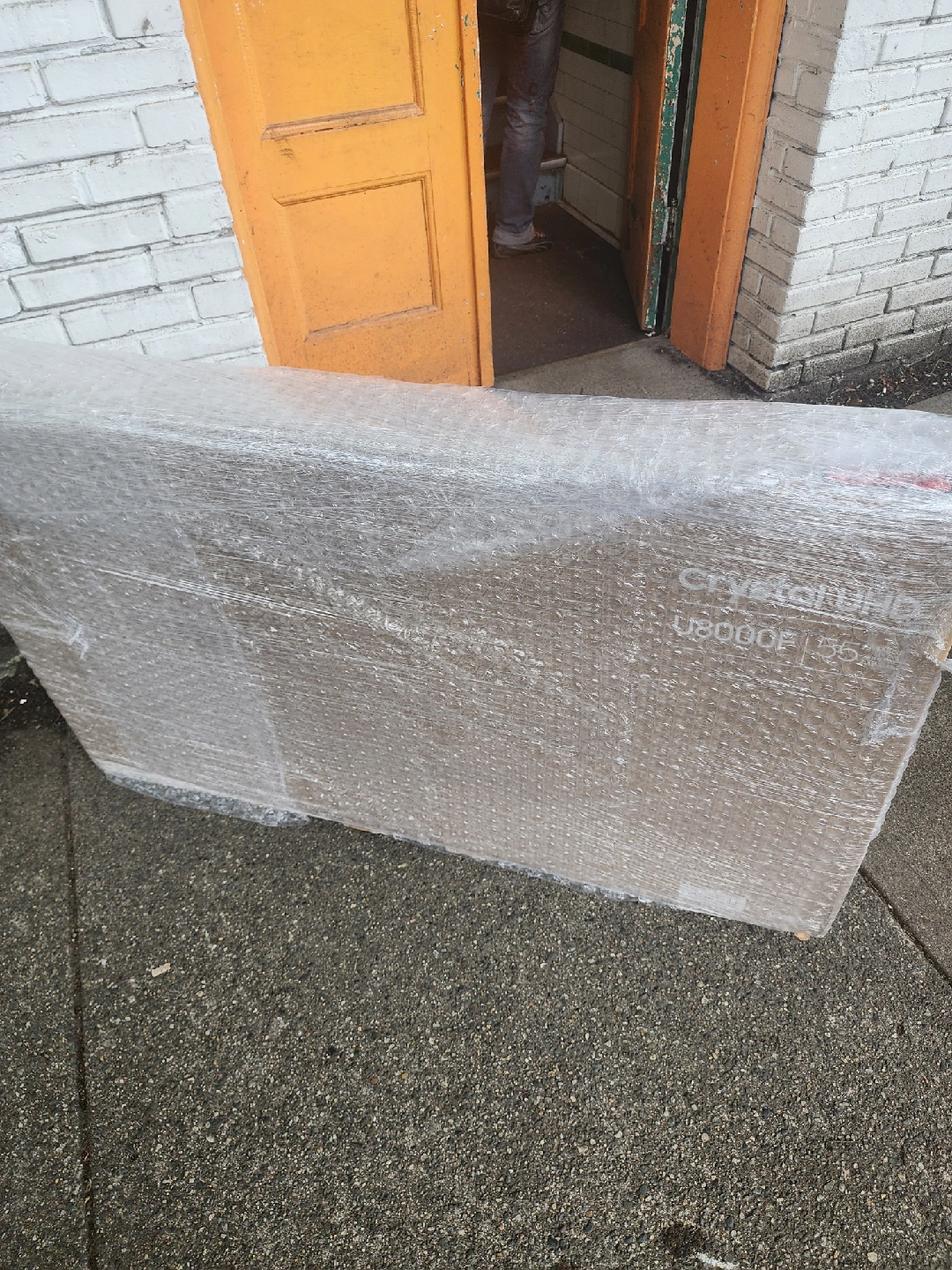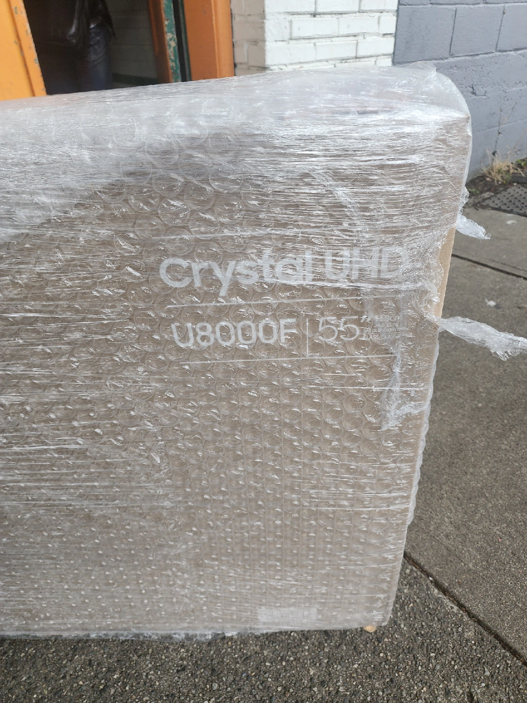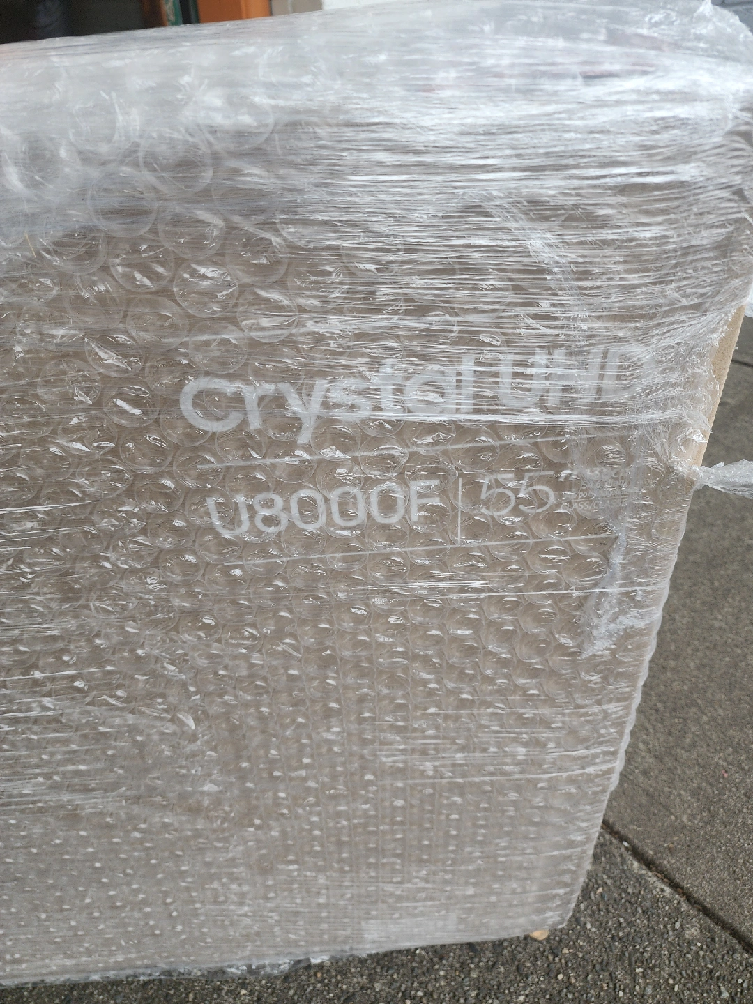 Black Hisense TV, TV white stand, Soundbar and Subwoofer
