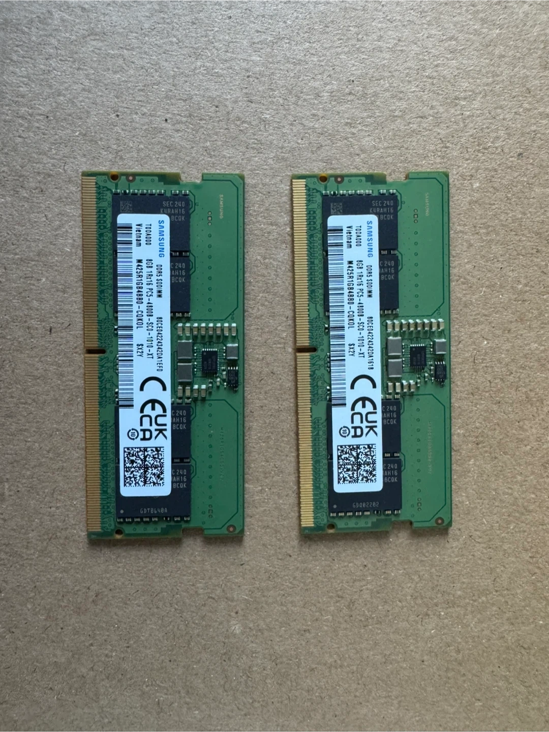 Selling two Samsung 8GB DDR5 SODIMM RAM sticks. They are 8GB 1Rx16 PC5-4800B-SCO-1010-XT. Model number M425R1GB4BB0-COKOL.