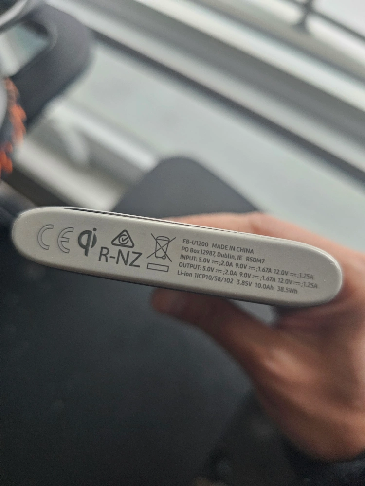 Selling a Samsung EB-U1200 wireless charger power bank. It's in good condition and ready to keep your devices charged on the go! It supports fast charging and is lightweight and portable. It has a capacity of 10000mAh.