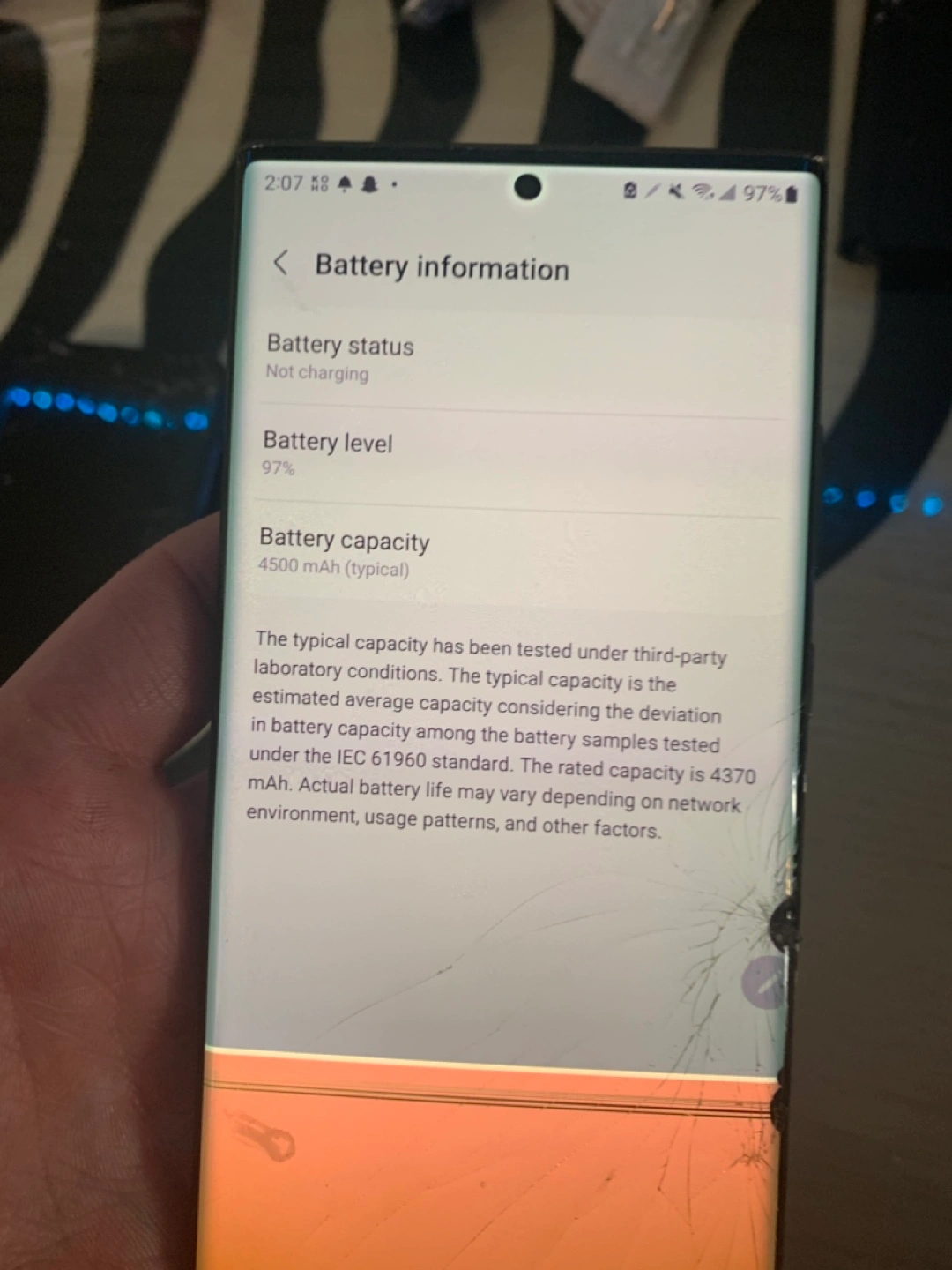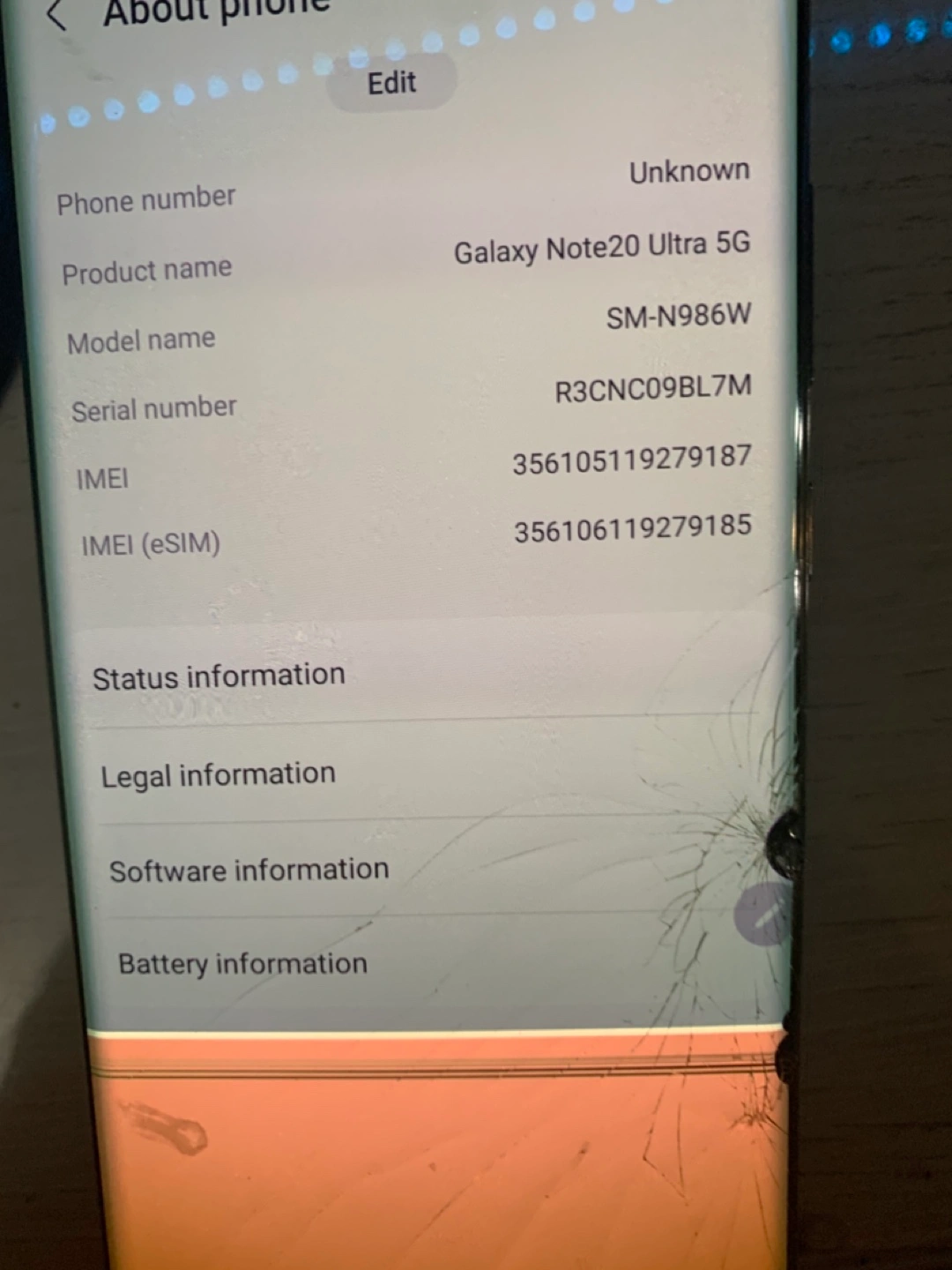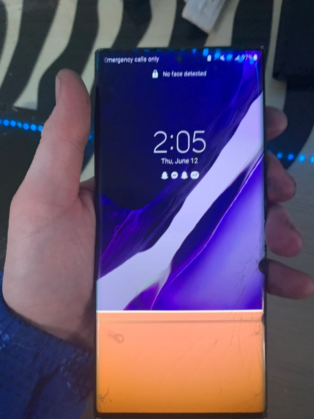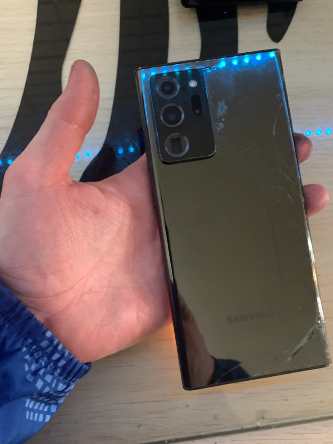 A black smartphone, possibly with some cosmetic damage. It has a large display and multiple rear cameras. A perfect way to connect with family and friends. Half the screen is damaged but other half is still functional. Probably need to replace screen but besides that works great. $175 obo