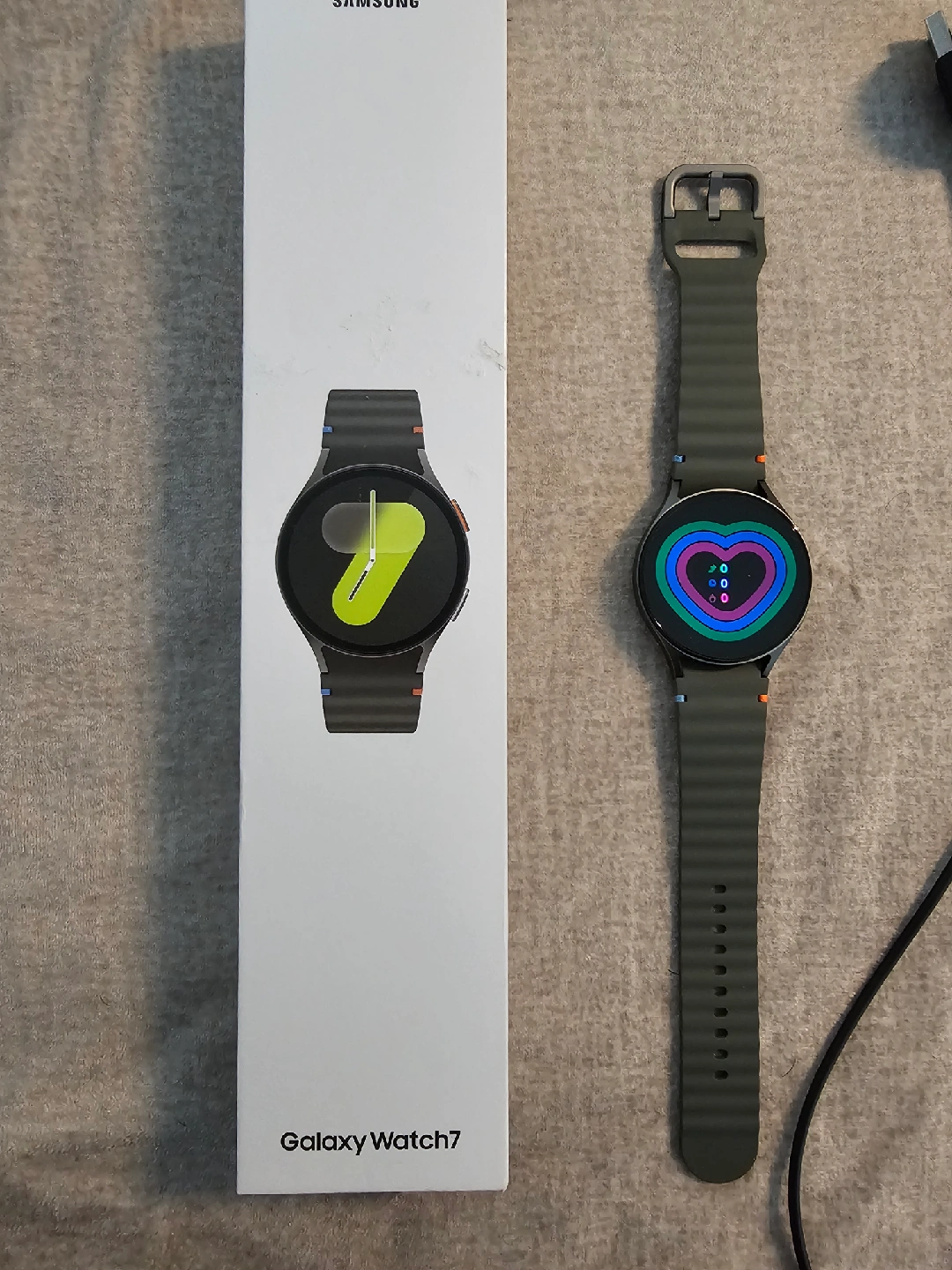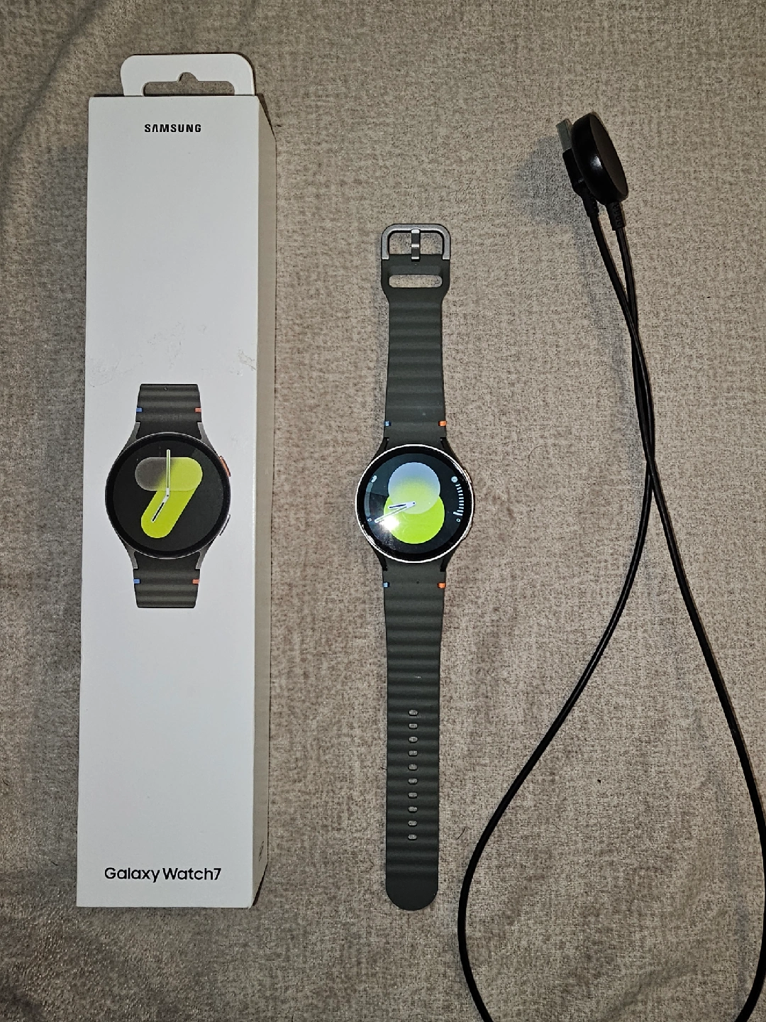 Selling a Samsung Galaxy Watch 7 in green, 44mm size. It comes with the original box and charger. The watch is in great condition and ready for a new owner!