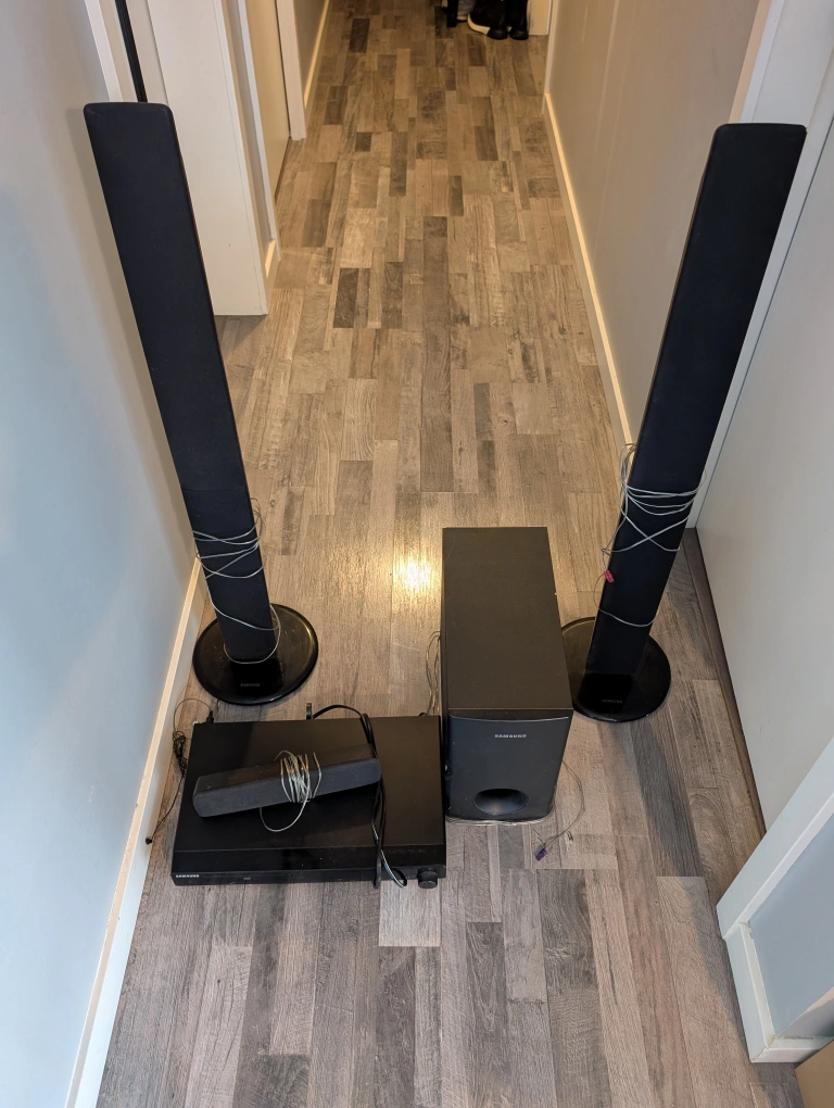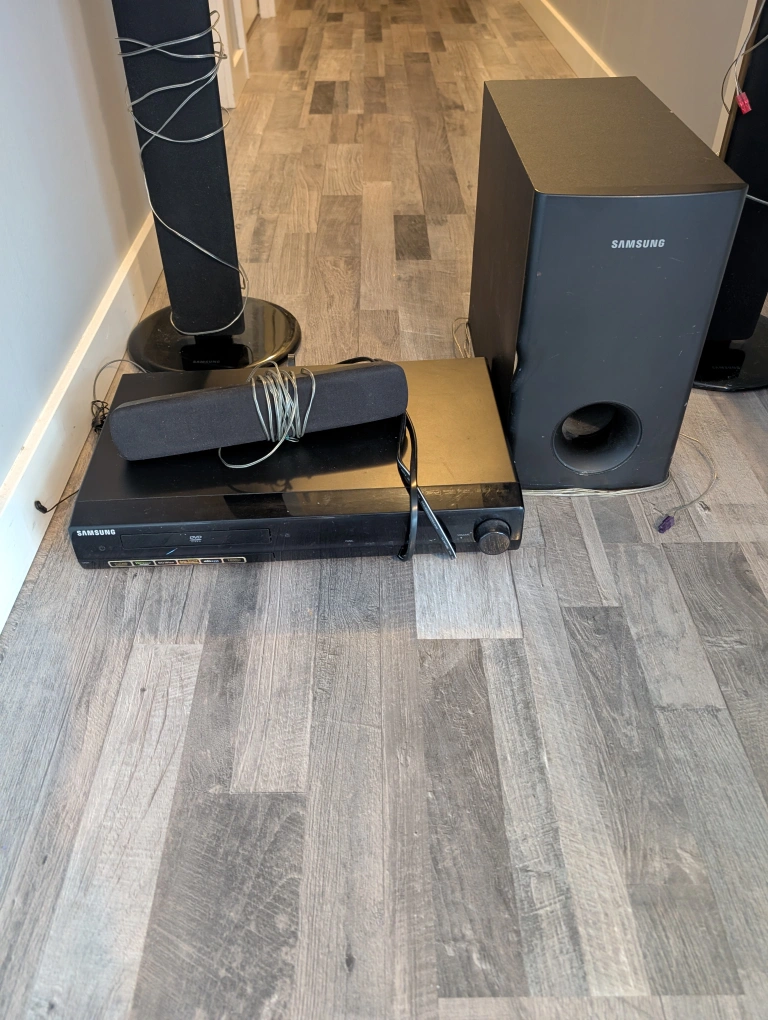 10Selling a Samsung home theatre system. Includes the subwoofer, DVD player, and speakers shown in the photos. Great for enhancing your movie nights or listening to music around the house