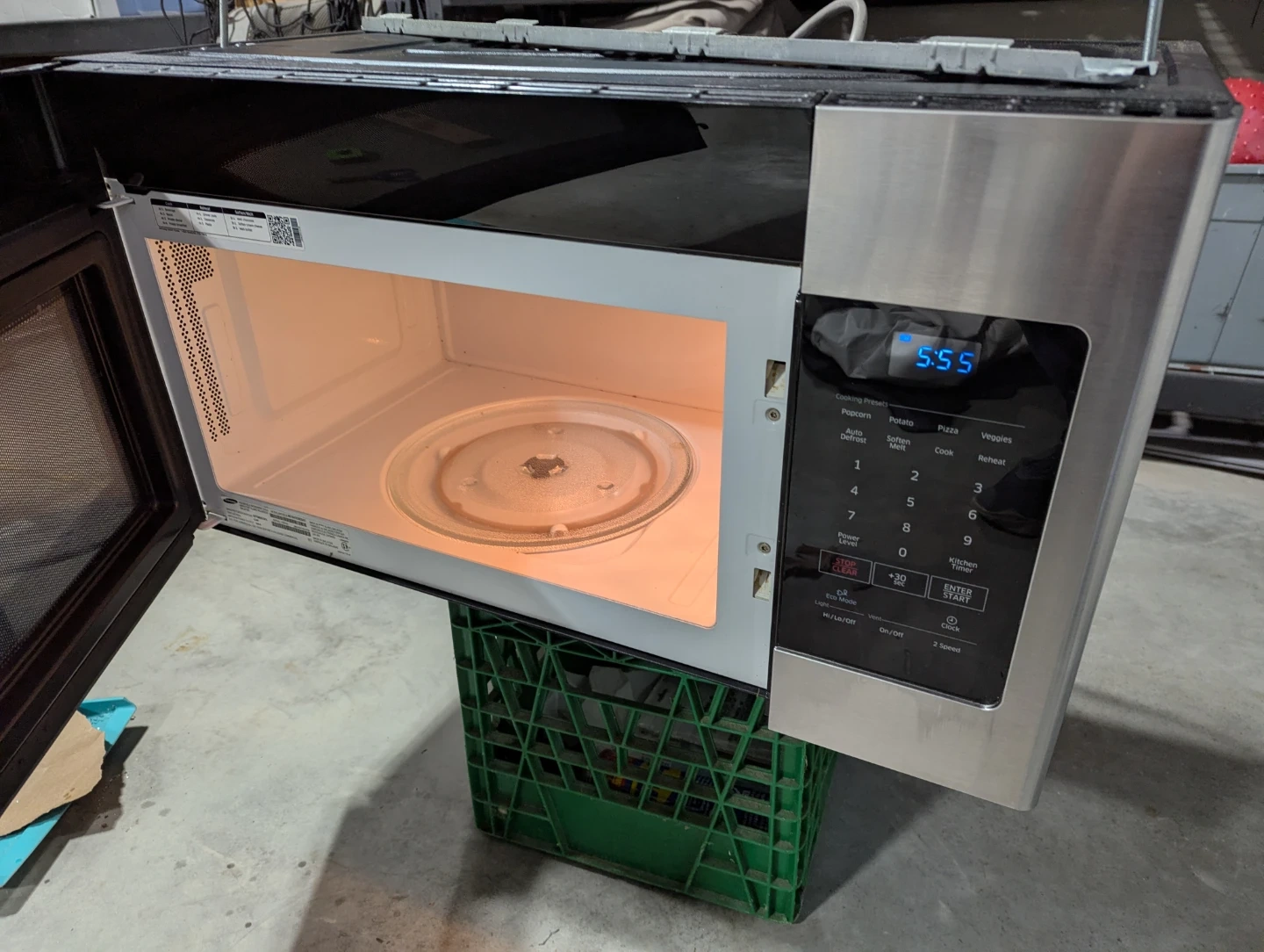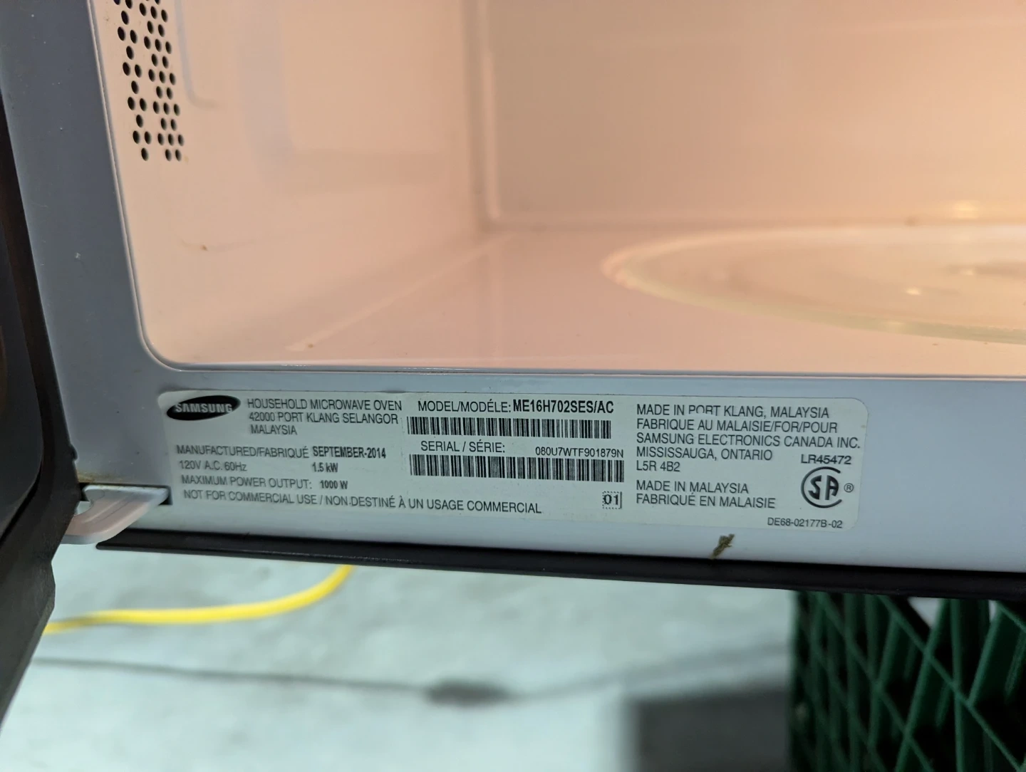 60Selling a Samsung microwave oven, model number ME16H702SES/AC. It's a household microwave oven with a 1.5 kW power rating and a maximum microwave output of 1000 W. Made in Malaysia.