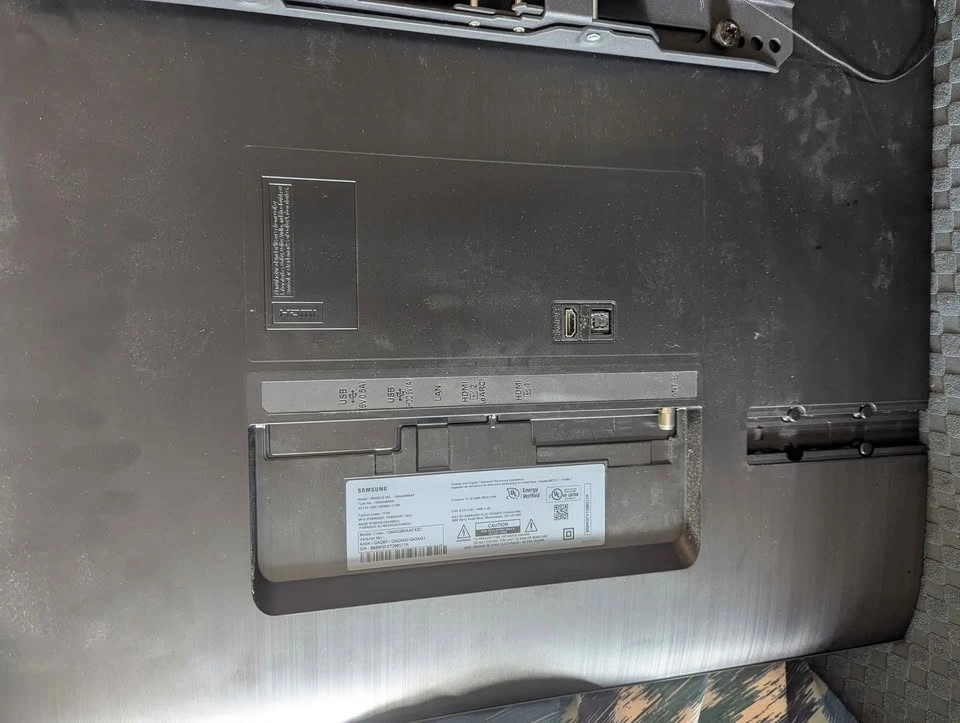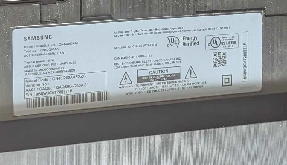 Samsung QLED 4k Smart TV model #43Q60A. It's a 43-inch, 2021 model 4K television that features Quantum Dot technology, a 60Hz refresh rate, and the Tizen smart platform. It is designed for a good viewing experience in bright rooms, with support for streaming services. Key features include Quantum HDR, a Q-Symphony audio enhancement, and connectivity options such as 3 HDMI ports. No stand, no remote (a Rogers remote, Google TV remote, universal remote can work for the TV)