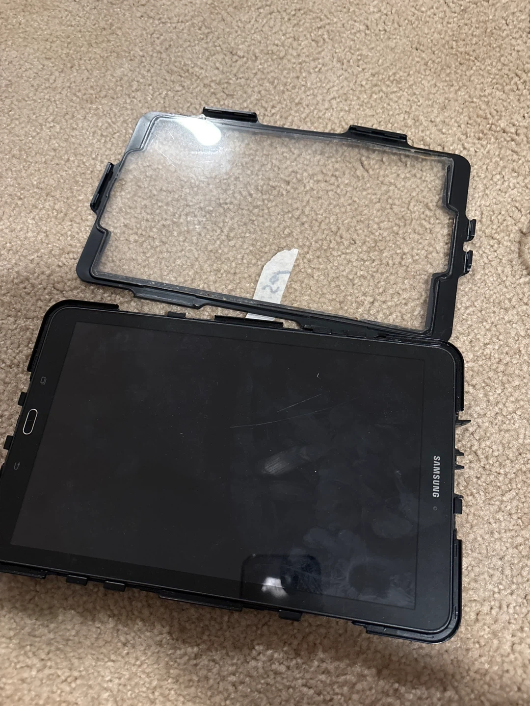 15Selling a Samsung tablet that comes with a protective case. The tablet shows some signs of use, including scratches on the screen. The case is black and appears to offer good protection for the device. Please take a look at the pictures for a closer look at the condition