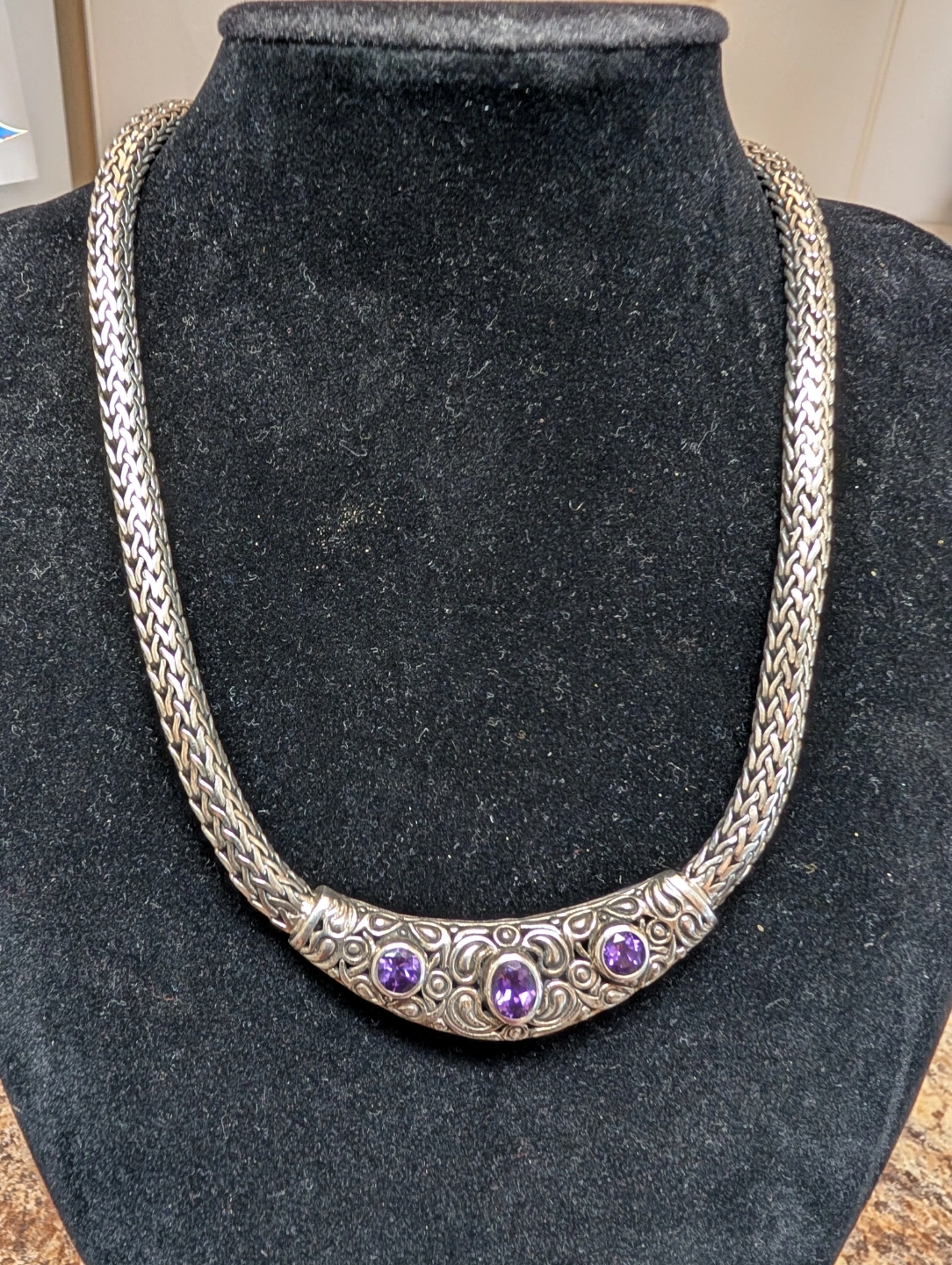 Beautiful 925 sterling silver necklace. Made in Bali. Features a unique chain design and three amethyst stones. 90 grams. 18" length.
