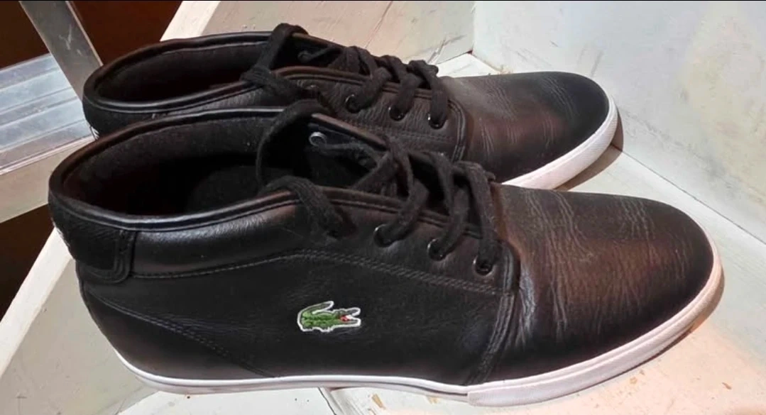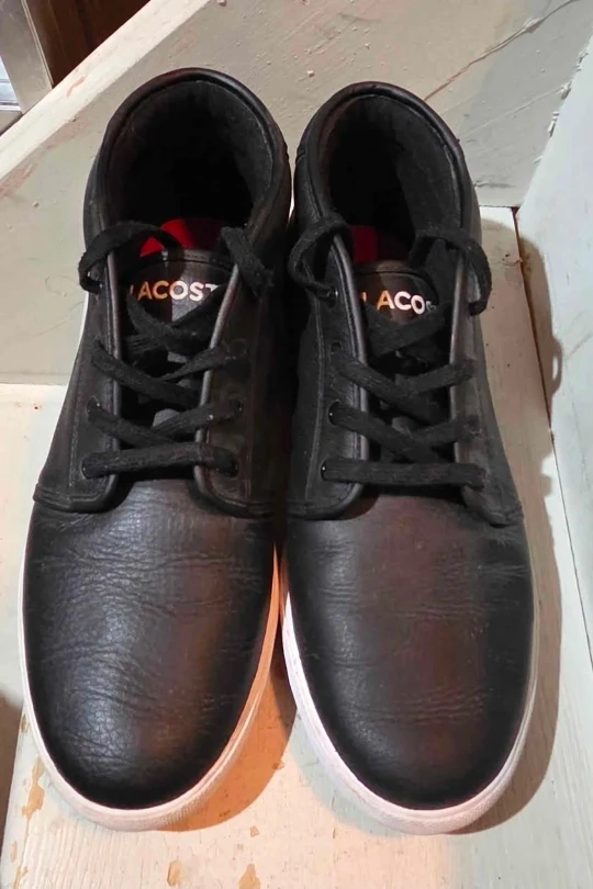 Selling a pair of Lacoste black leather sneakers! They're in good condition and have the classic Lacoste logo on the side