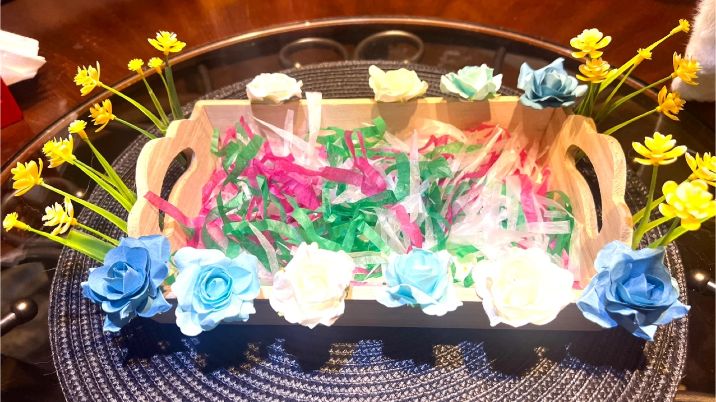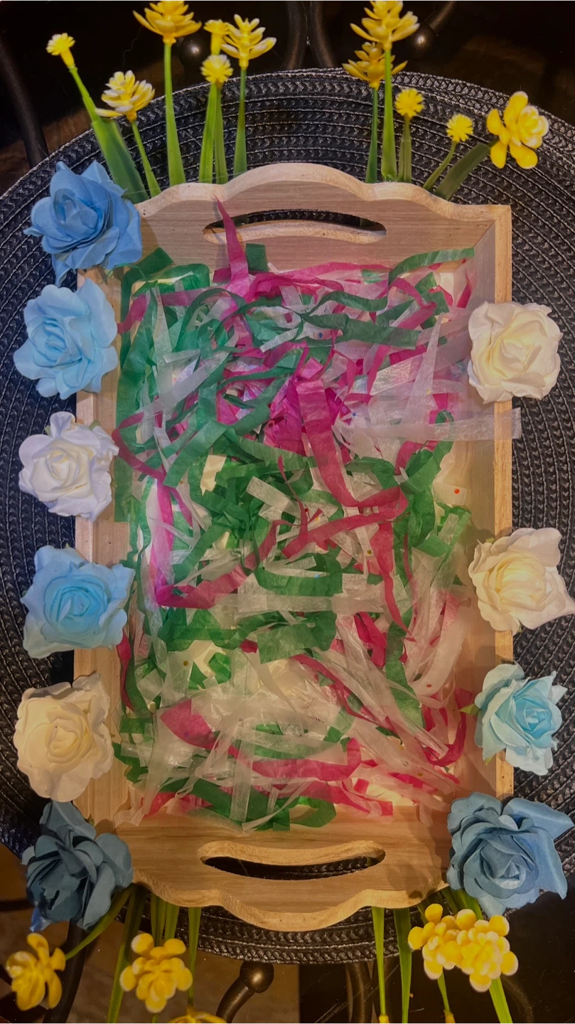This wooden tray is decorated with artificial flowers and filled with colourful shredded paper. It's perfect for Easter egg hunts or as a decorative centrepiece. Home-made and used last Easter.