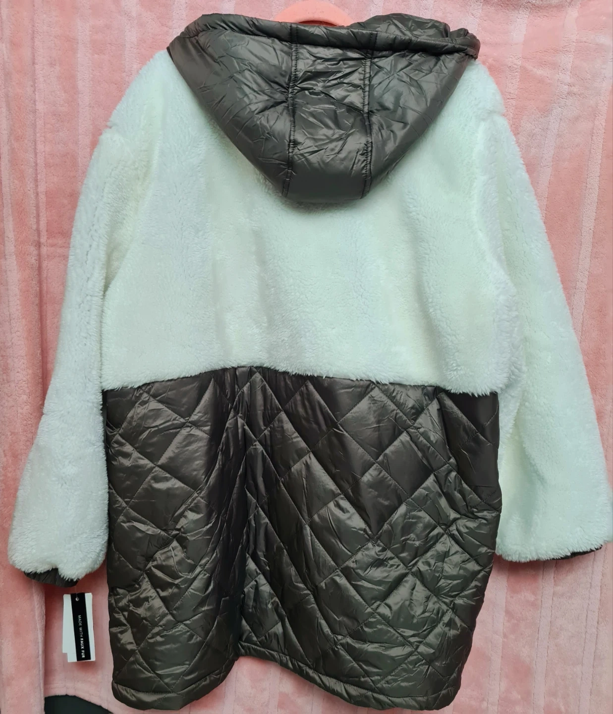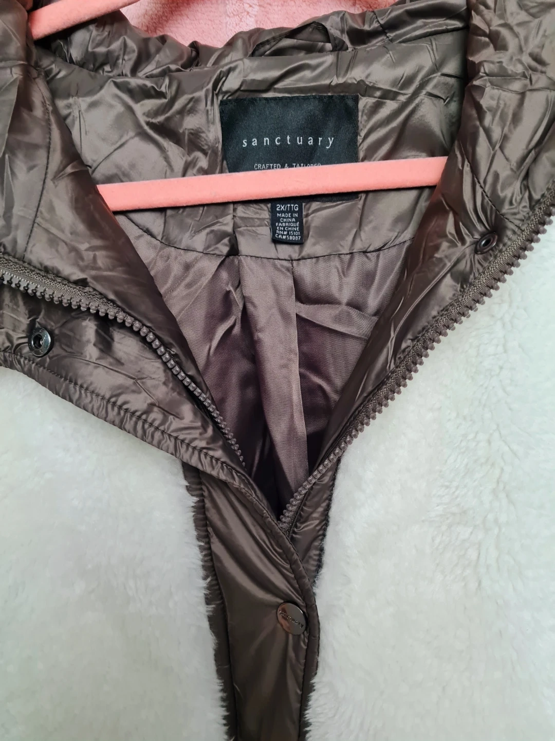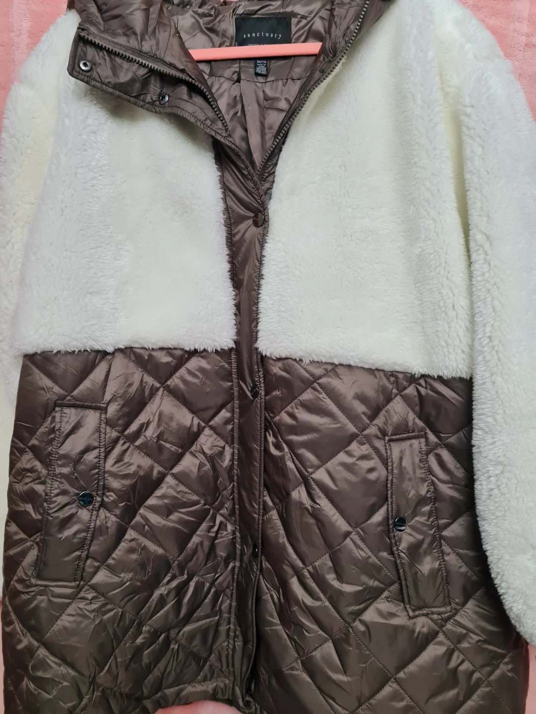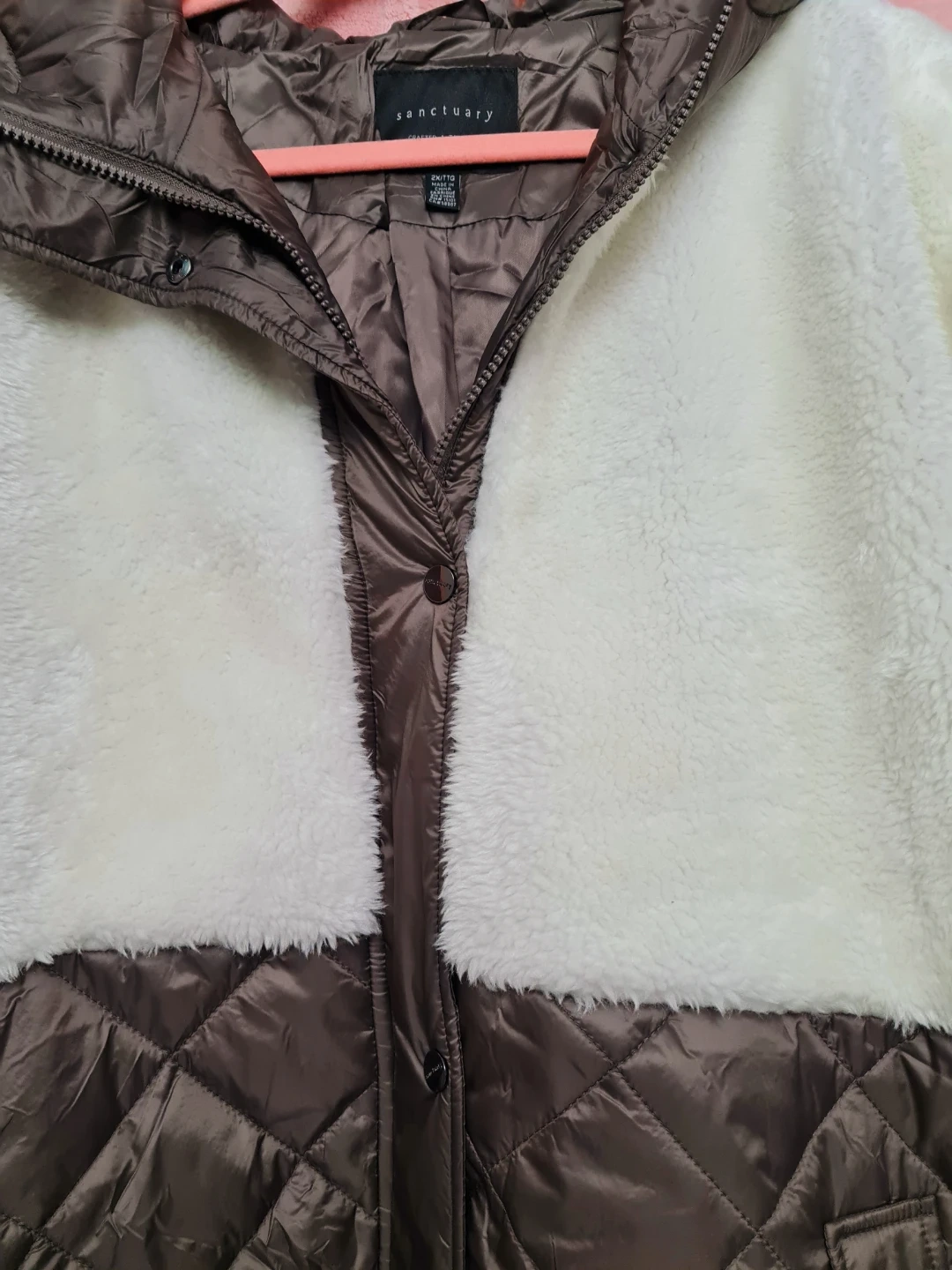 19Brand new with tag, larger-size jackets suitable for the coming season. Cozy Sanctuary hooded jacket in size 2X! It features a stylish combination of white Faux Fur and brown quilted fabric. Originally bought for $219.00